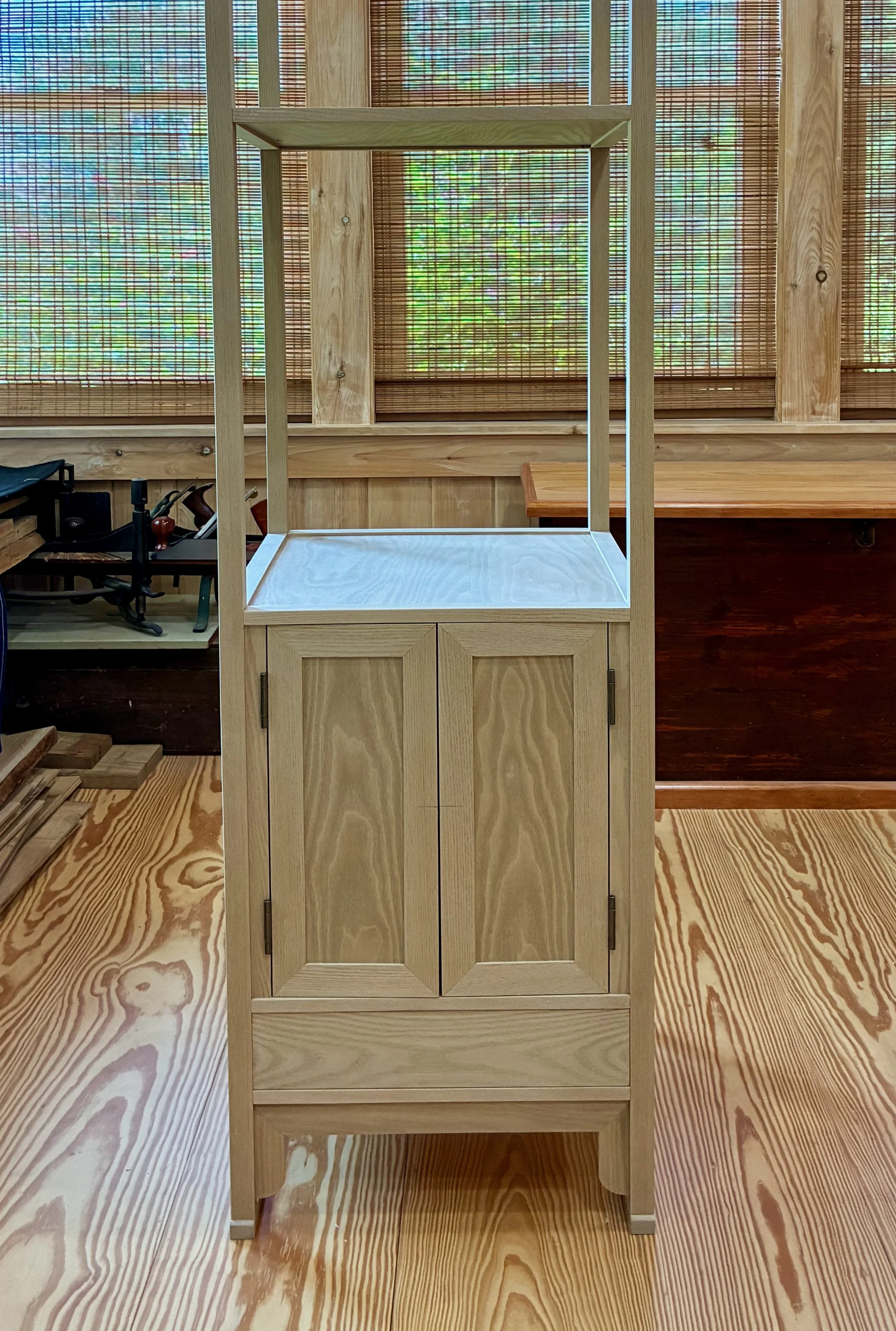 I converted the mm spans into inches and then encountered a problem: at a finished height of just over 4 feet, the piece described would be too short. A “three story table” of that height might be perfect for a floor-sitting Korean lifestyle, but it would not blend well with the other furnishings in our living room. No worries, I figured I could apply a 1.3x scaling factor to every number and enlarge the item proportionally. That works fine in “decimal land” but it gets cumbersome when translating things back to inches, the language of my workshop tools. (One millimeter = 197/5,000th of an inch). I was about to begin the tedious conversions, rounding numbers up or down to the nearest 1/16th of an inch, when I recalled I had essentially made this furniture piece two years ago: the Korean Stand. For that Project I had divined the measurements from a small photograph and used those plans to produce a beautifully proportioned set of open shelves. I could essentially use the same part dimensions for this one, tweak a few details to add the cabinet section and make a respectable version of the sabang-t’akja depicted in the plans above. Reduce, reuse, recycle (and stay sane)!