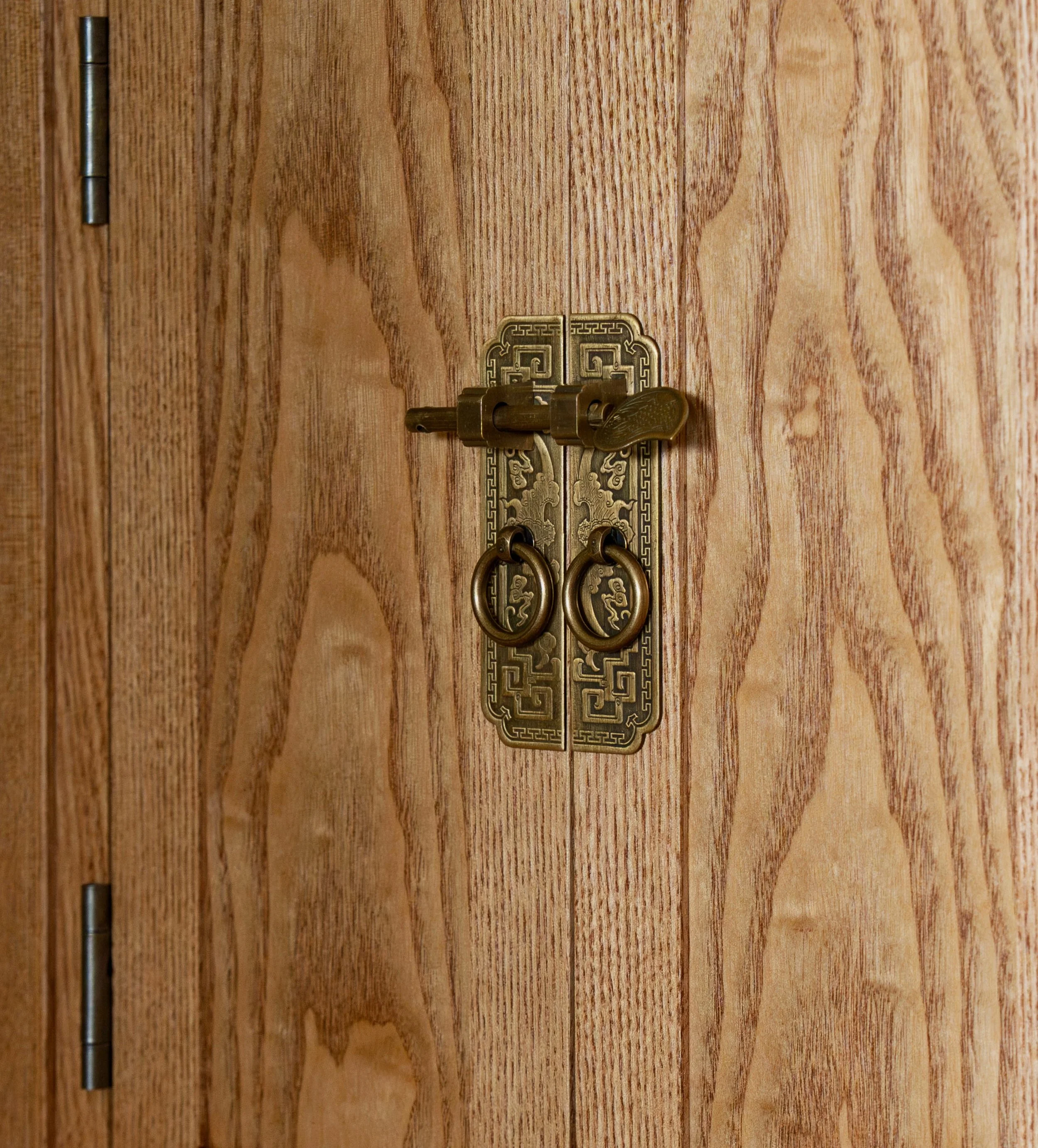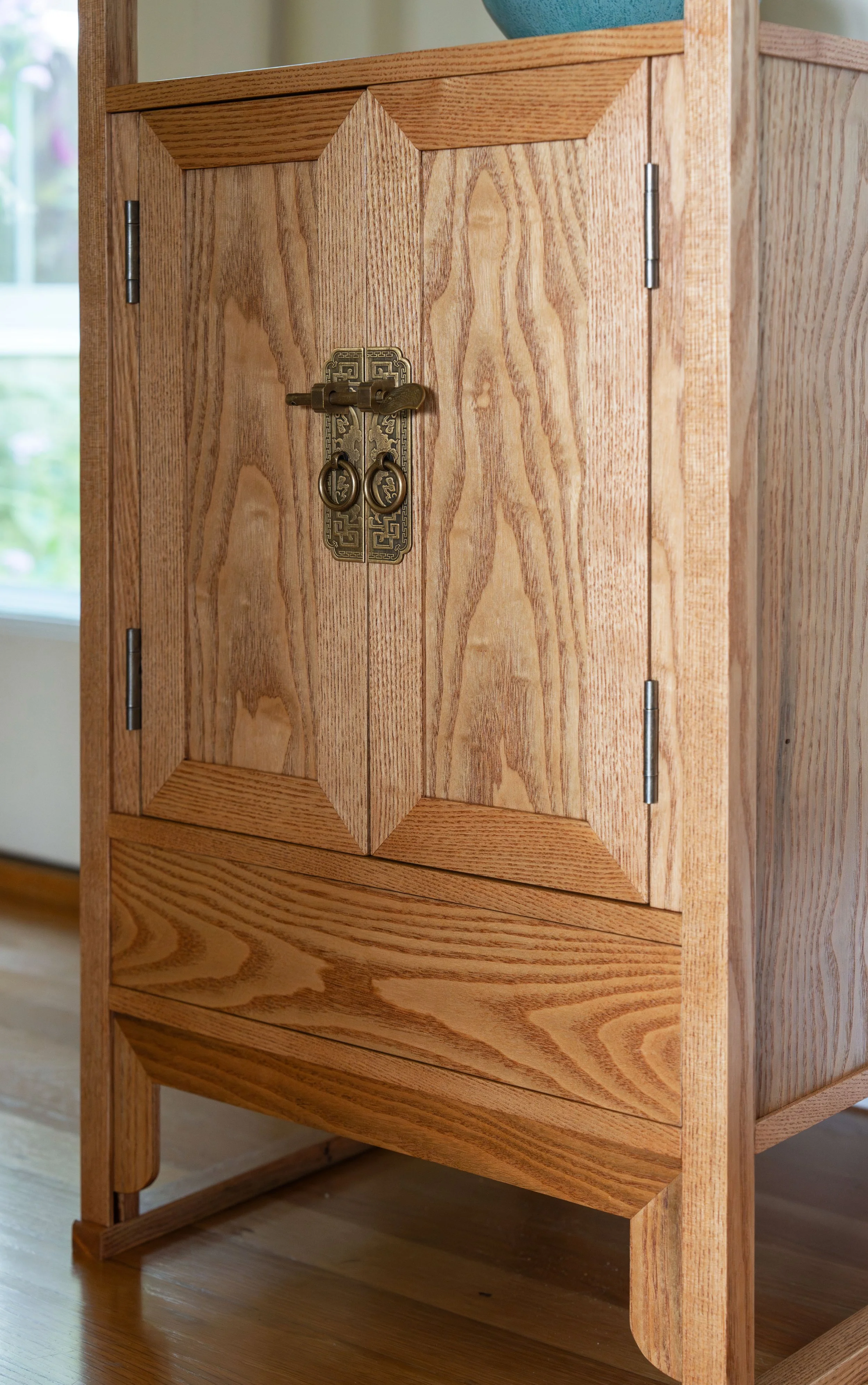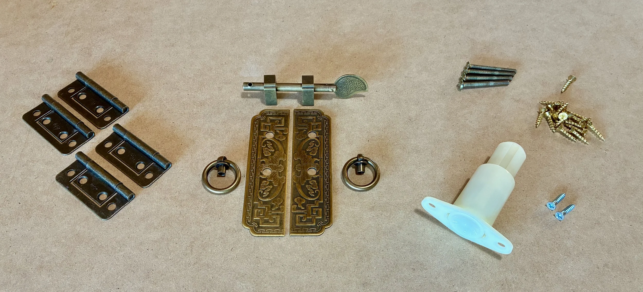Let’s talk hardware. Alas, procuring traditional Korean furniture hardware is a challenge in the 21st century. Over time, I have accumulated a small assortment of these treasures, almost exclusively in black, mimicking the iron fittings used for kitchen cabinets, trunks and such. The brass stuff is very hard to find, but that is the material I wanted for this piece. What I did find was a Chinese-inspired latch in antique brass from an Etsy merchant (FashionLook4U) that might look nice to anchor the cabinet portion. What I could not find was a suitable surface mounted hinge set in antique brass to match. Rather than resort to a mis-match that would distract from the latch, I went with non-mortise butt hinges, where only the barrels would be visible. As to the drawer, I wanted it to be a secret so no hardware was required here, just a spring-loaded drawer kicker with a mechanism akin to that of a retractable ball point pen. The hinges and kicker were obtained from Lee Valley Tools, a nice Canadian firm.