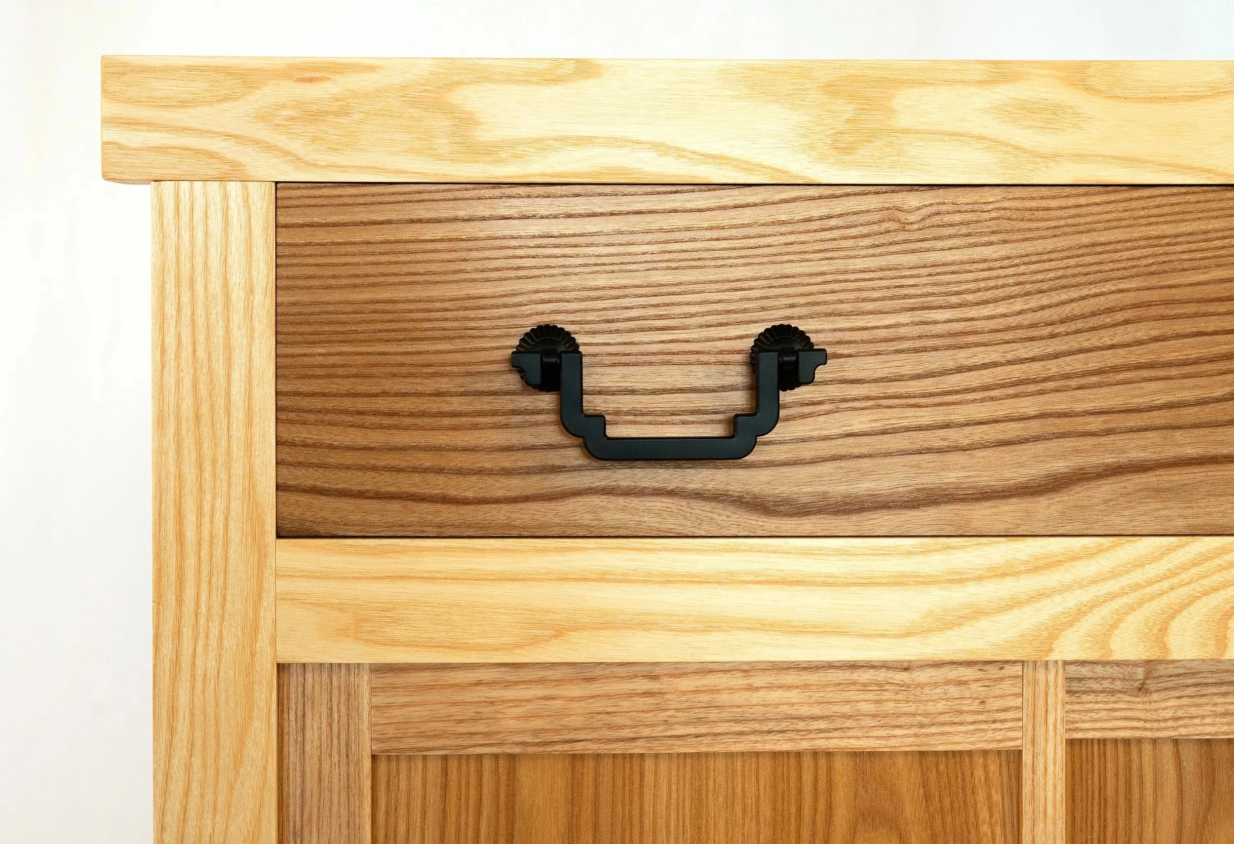 The door hardware was procured online from a nicely run hardware business, Hardwick & Sons: ball tipped hinges and a Craftsman style drop pull. These designs, in a copper finish, are very close to the Stickley originals.