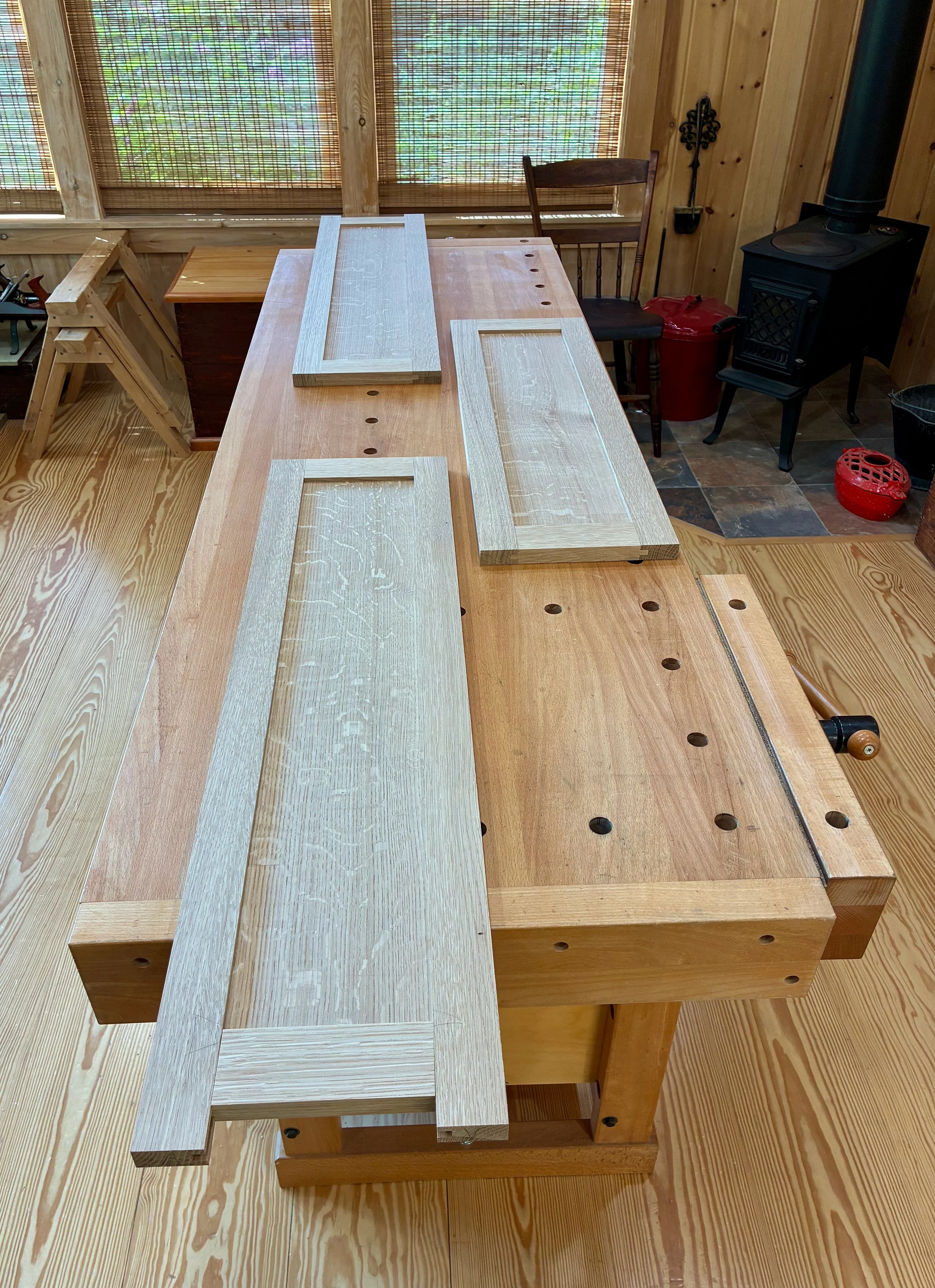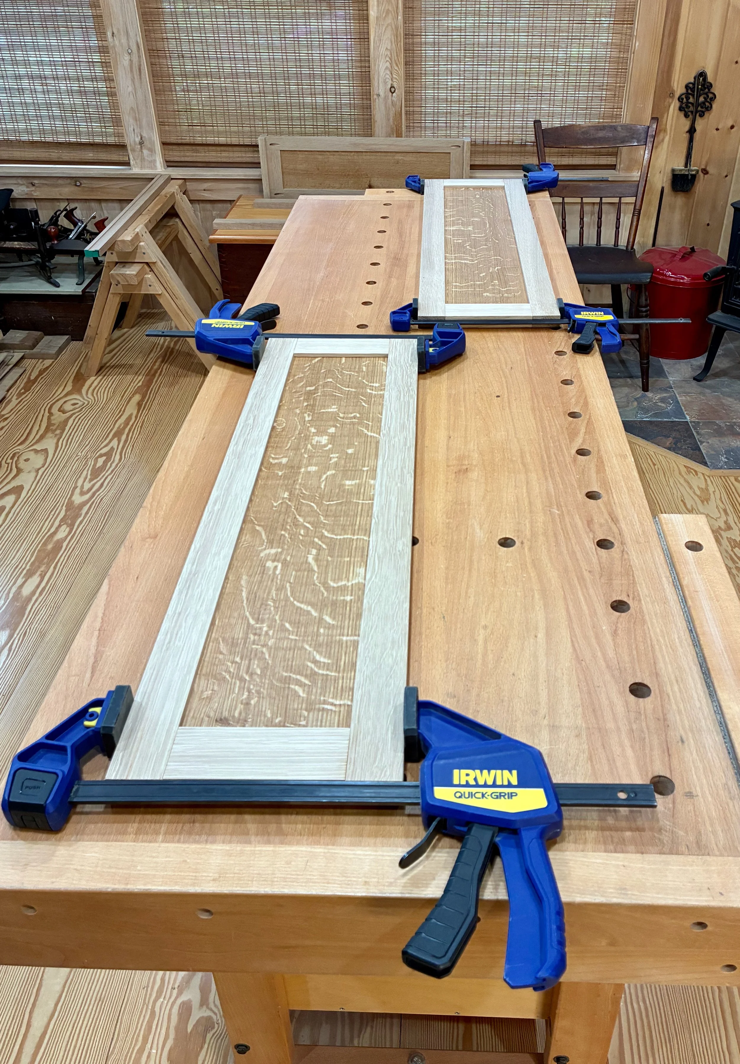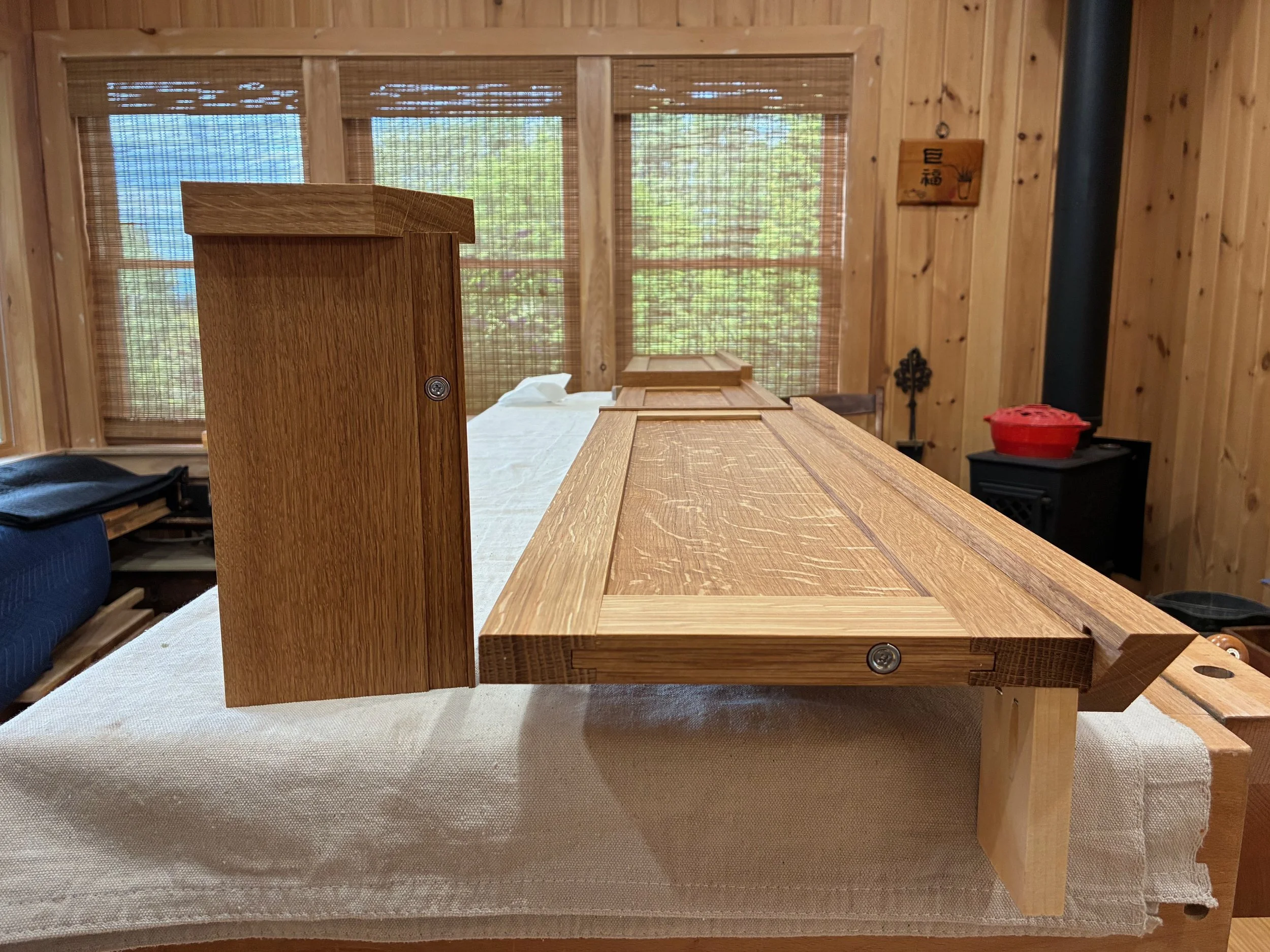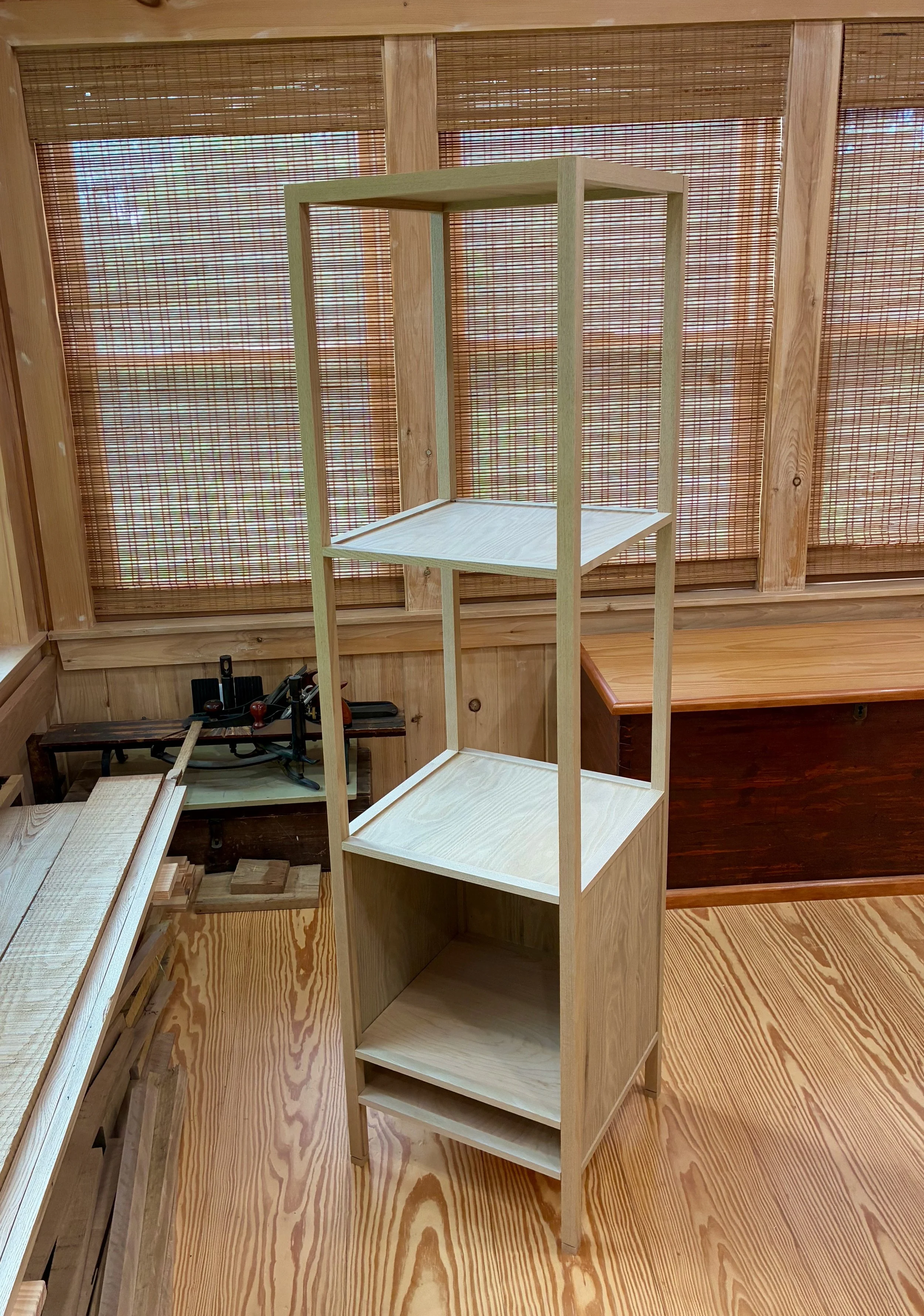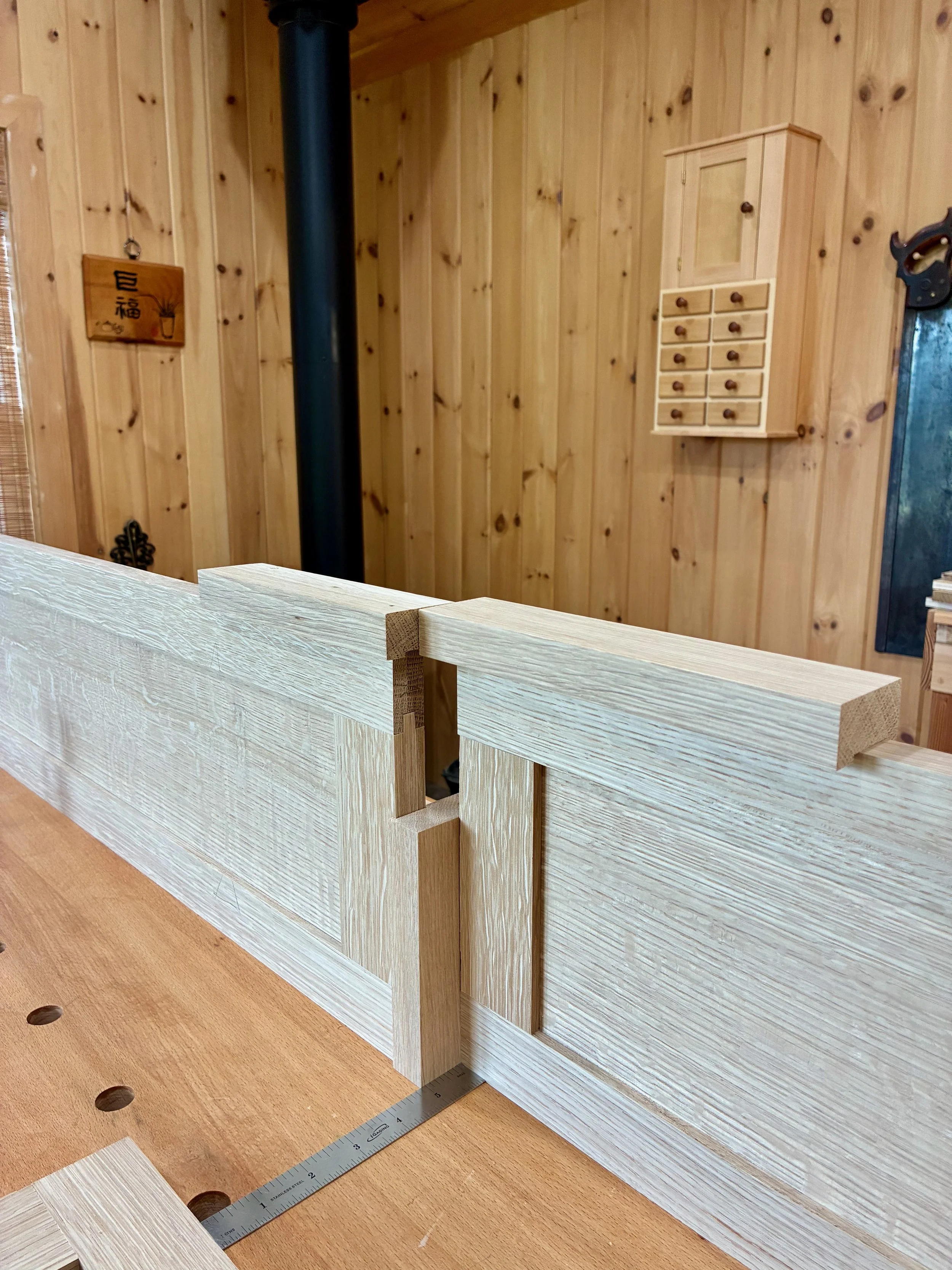 After some easing of the edges with a hand plane, the panel parts were dry-fit with the poles and rails. This serves to stiffen the structure and gives a first glimpse of the final form.
