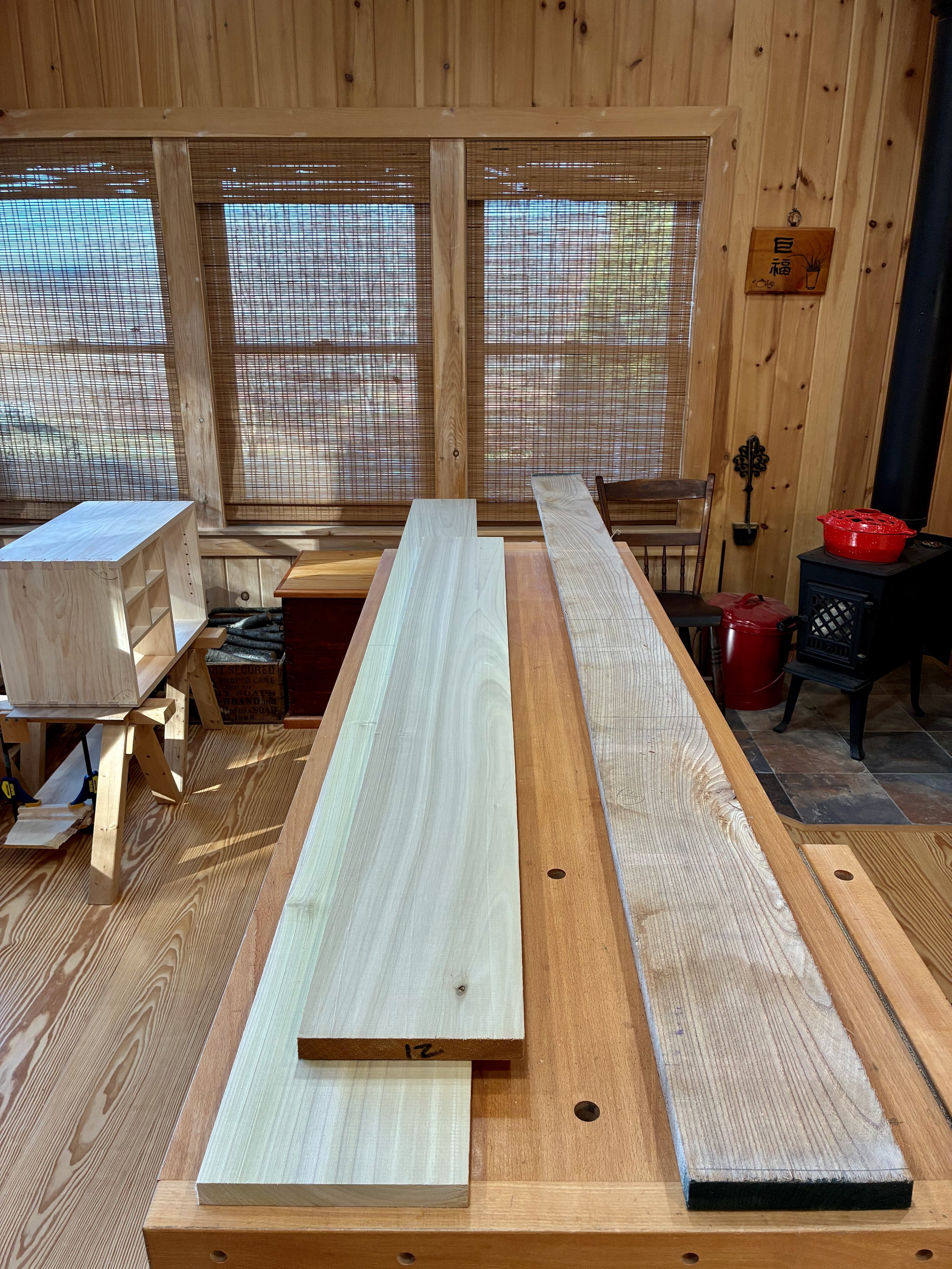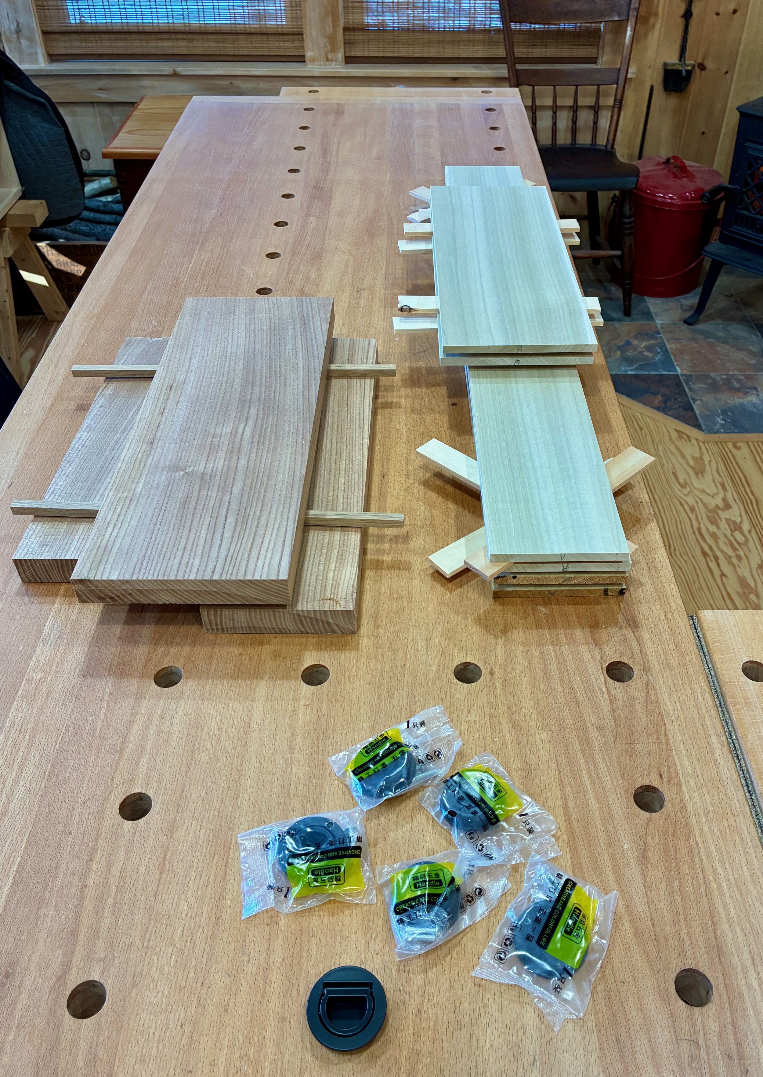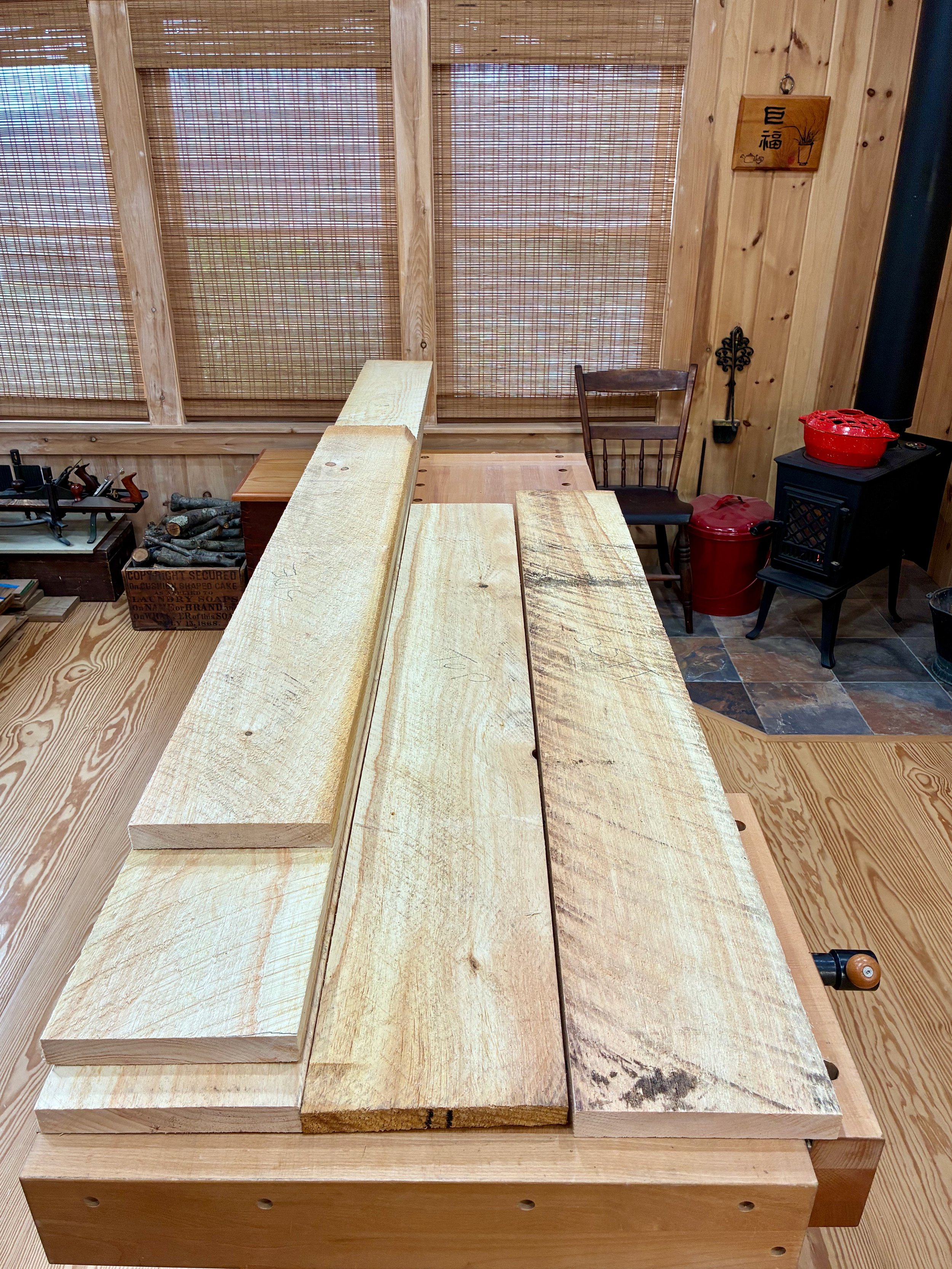 Cherry boards of six varieties, differing in their thickness, lumber mill cut and figure were purchased. Of special note was the 12 inch wide, plain sawn plank that would furnish the door fronts. Sixty-four board-feet, in all, were brought back from the choice selections at Highland Hardwoods. The hinge and door hardware would be finalized later in the build.