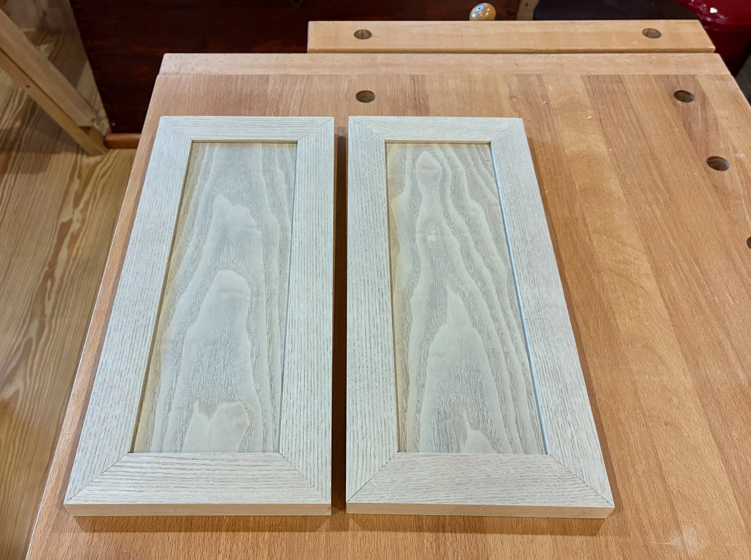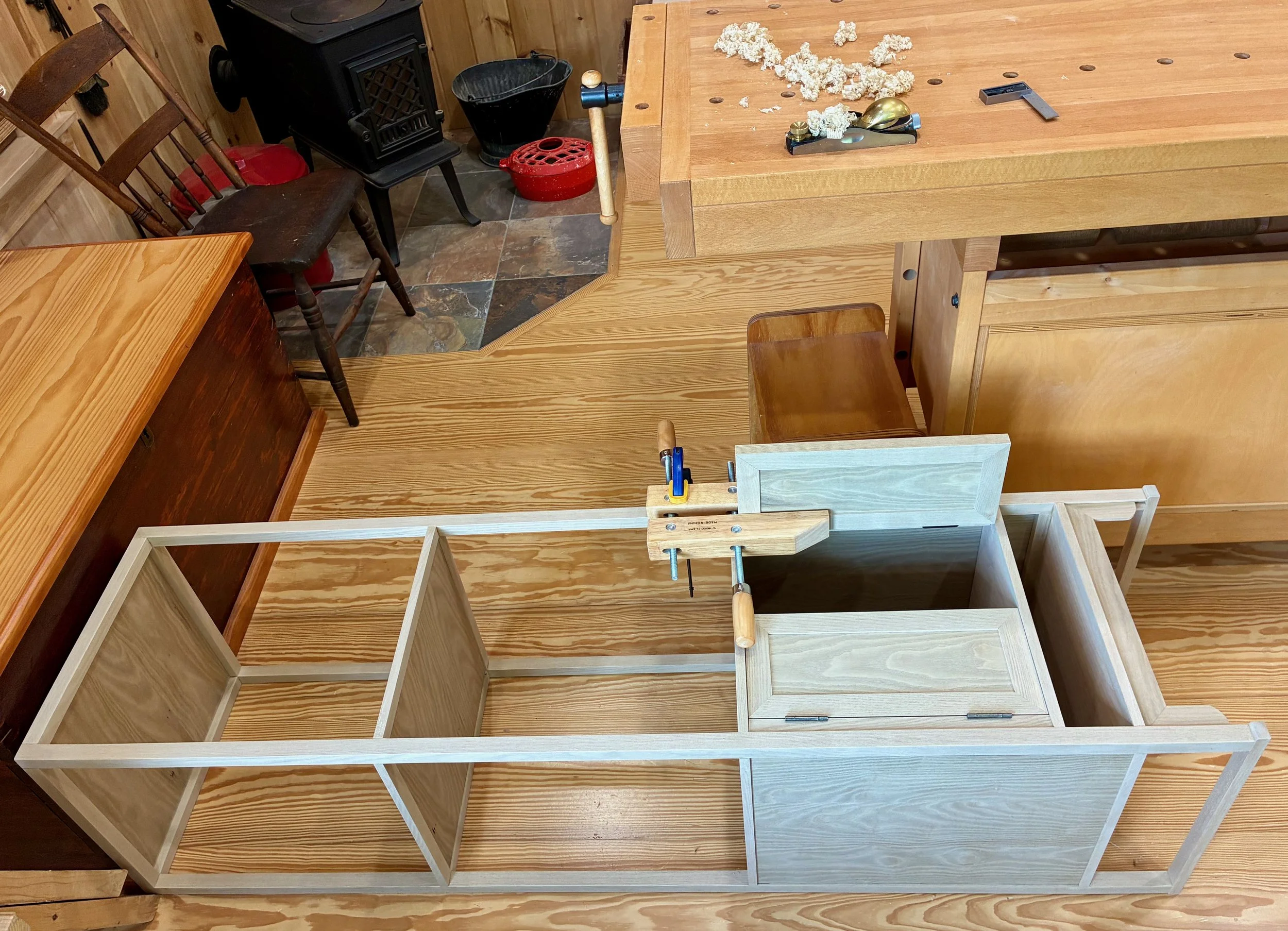 Assembly of the carcass was a smooth operation given the prior labelling of parts and some assistance from Joung. I’ve hit upon a favored sequence for these cabinet builds: assemble the back flat on the workbench; then raise the sides; and finally cap-off the front before standing the thing upright to cure.