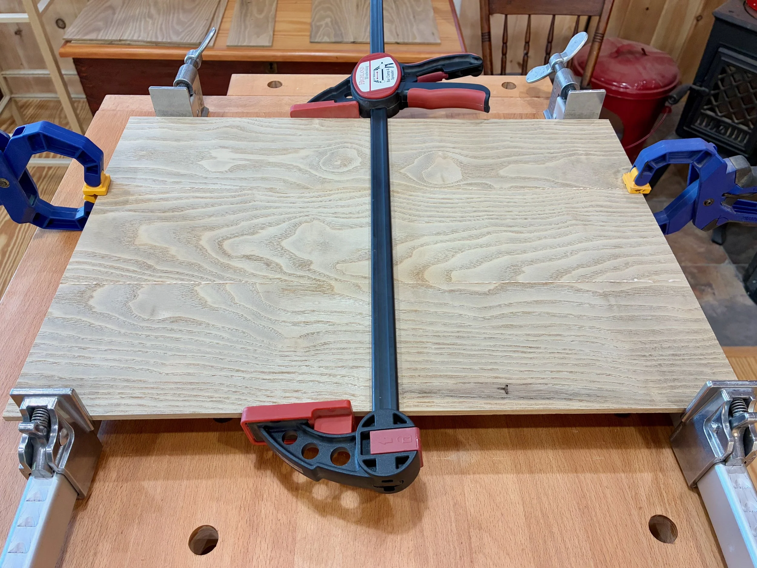 Four sides, a center shelf and a back are required for the carcass. In each case, the individual parts were made by glueing two smaller, previously prepped boards together, smoothing the surface and then cutting to their final dimensions.
