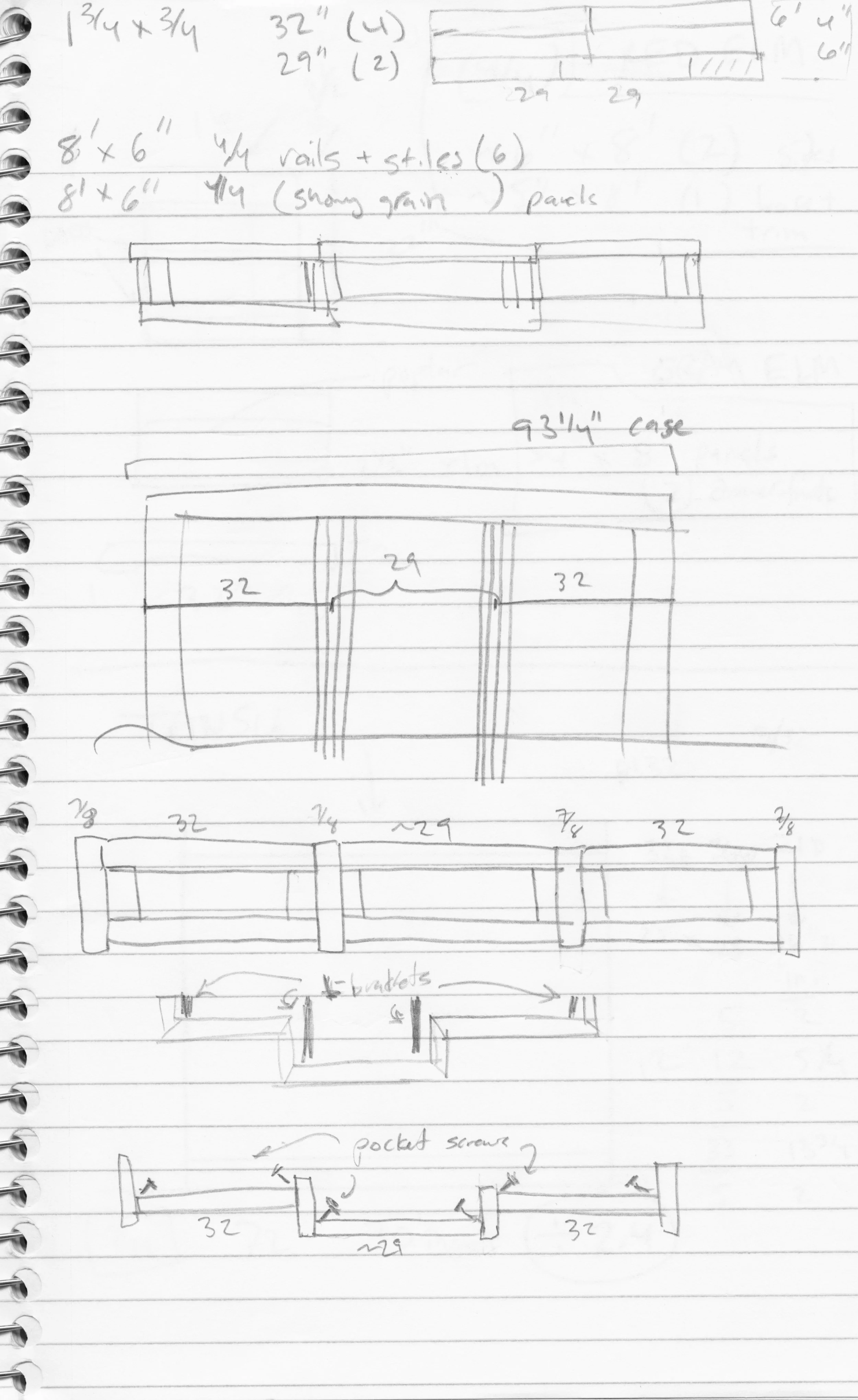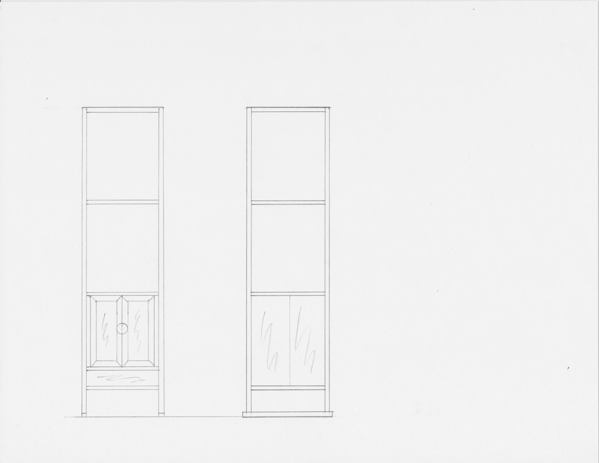 Starting from the Korean Stand work, a rough plan was sketched at 3/32 scale (in inches) of a 3 shelf unit with a doored cabinet enclosing the bottom section and standing 5 feet tall. It looked nice. My only change would be to convert the panel below the doors into a handy drawer for storage.