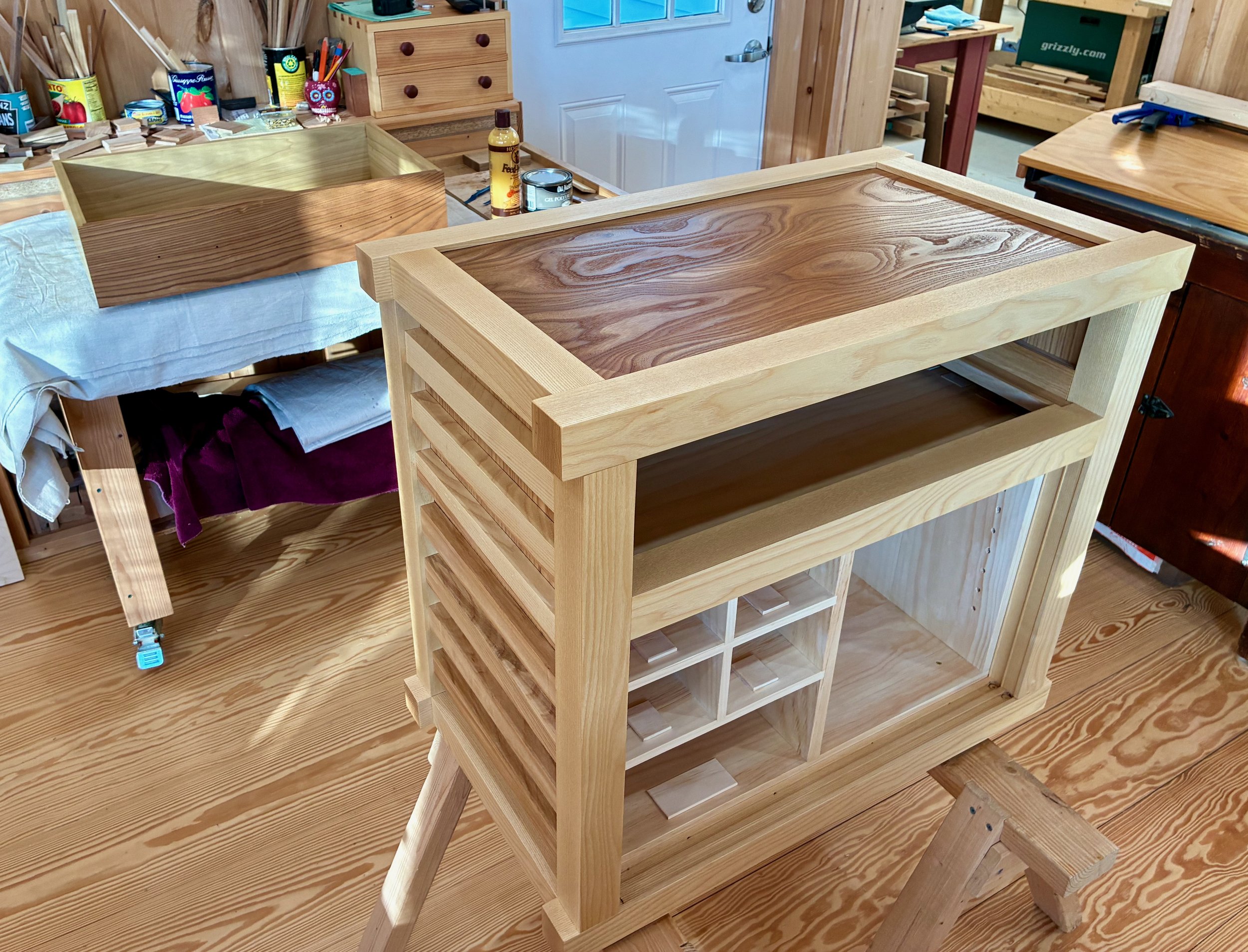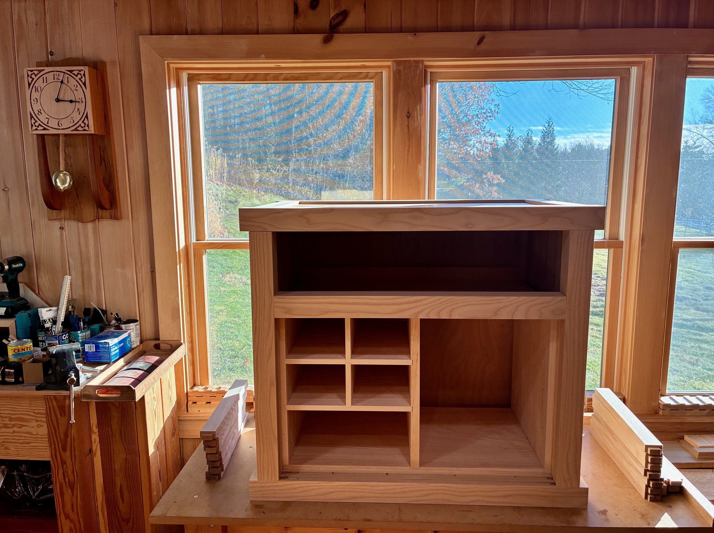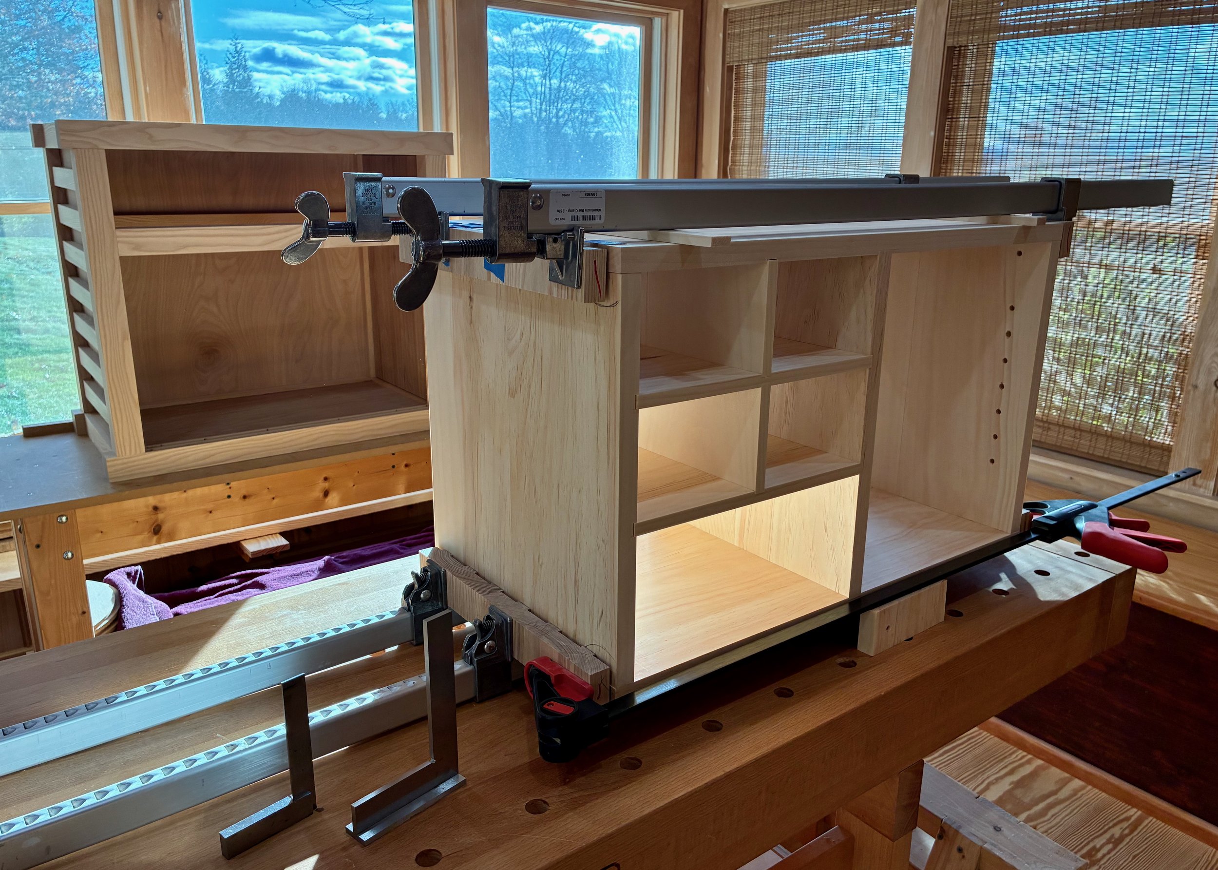 Assembly of the shelf unit proceeded stepwise in a sequence similar to the cabinet glue-up. I first put the two side “sub-assemblies” together as it is easier to square these up while they are lying prone on the workbench. Once cured they could be placed atop the cabinet for a first glimpse of the final form.