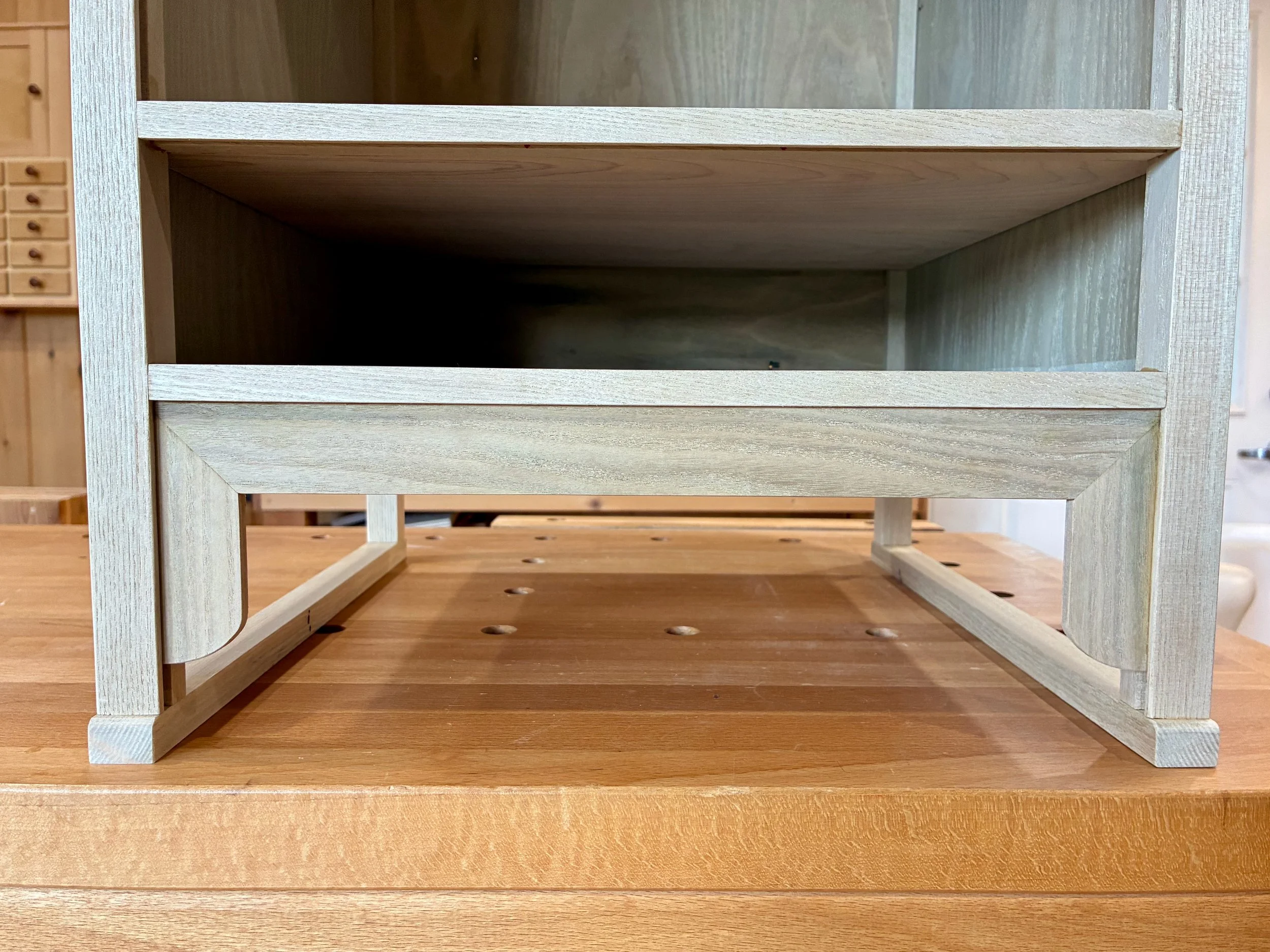 Final case assembly involved attaching the bracket to the underside of the shelf, constructing a bonnet (pediment) to place on top, and adding a door stop and wall mounting fixture. These all proceeded without incident and it was at last time to finish the wood.