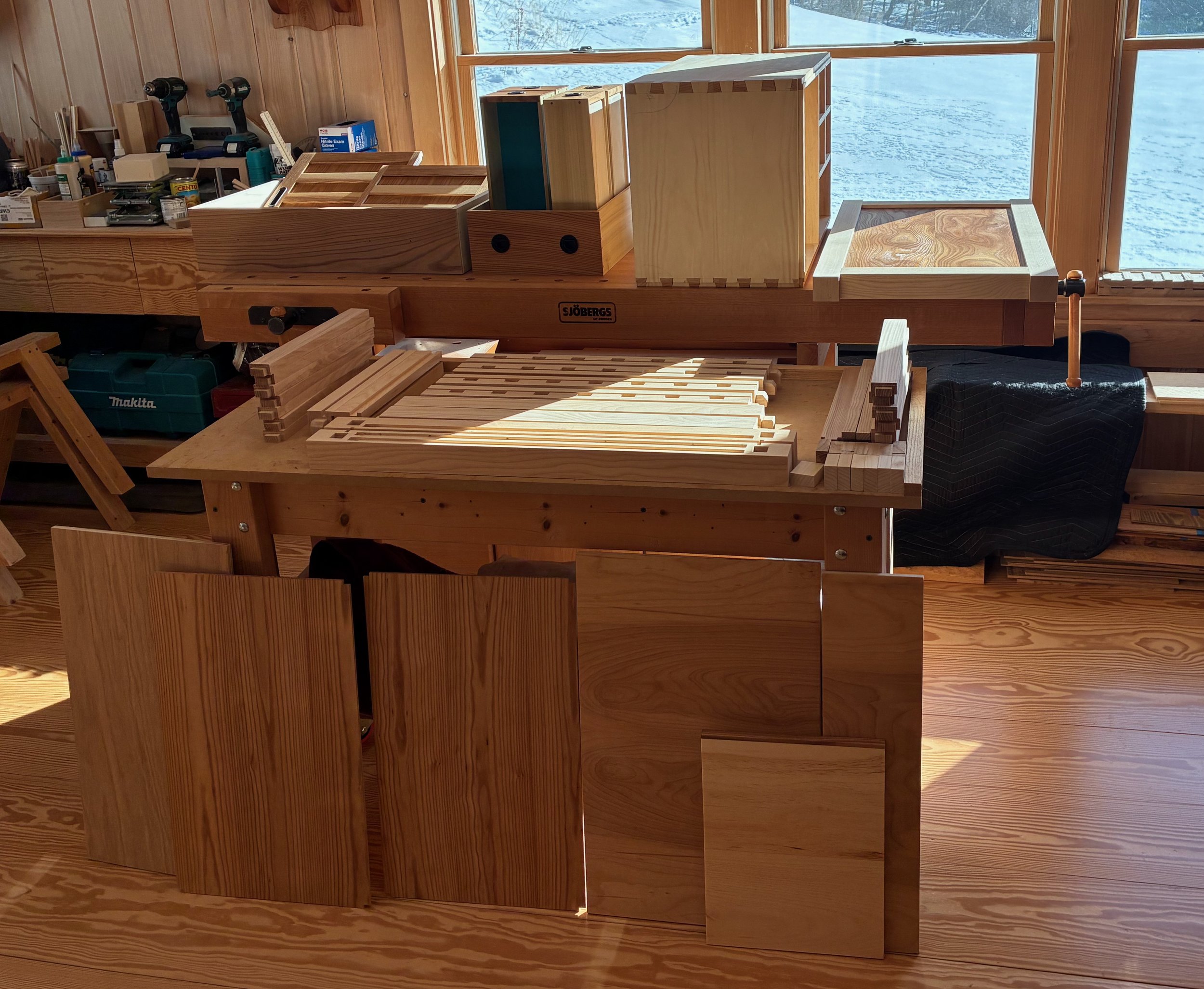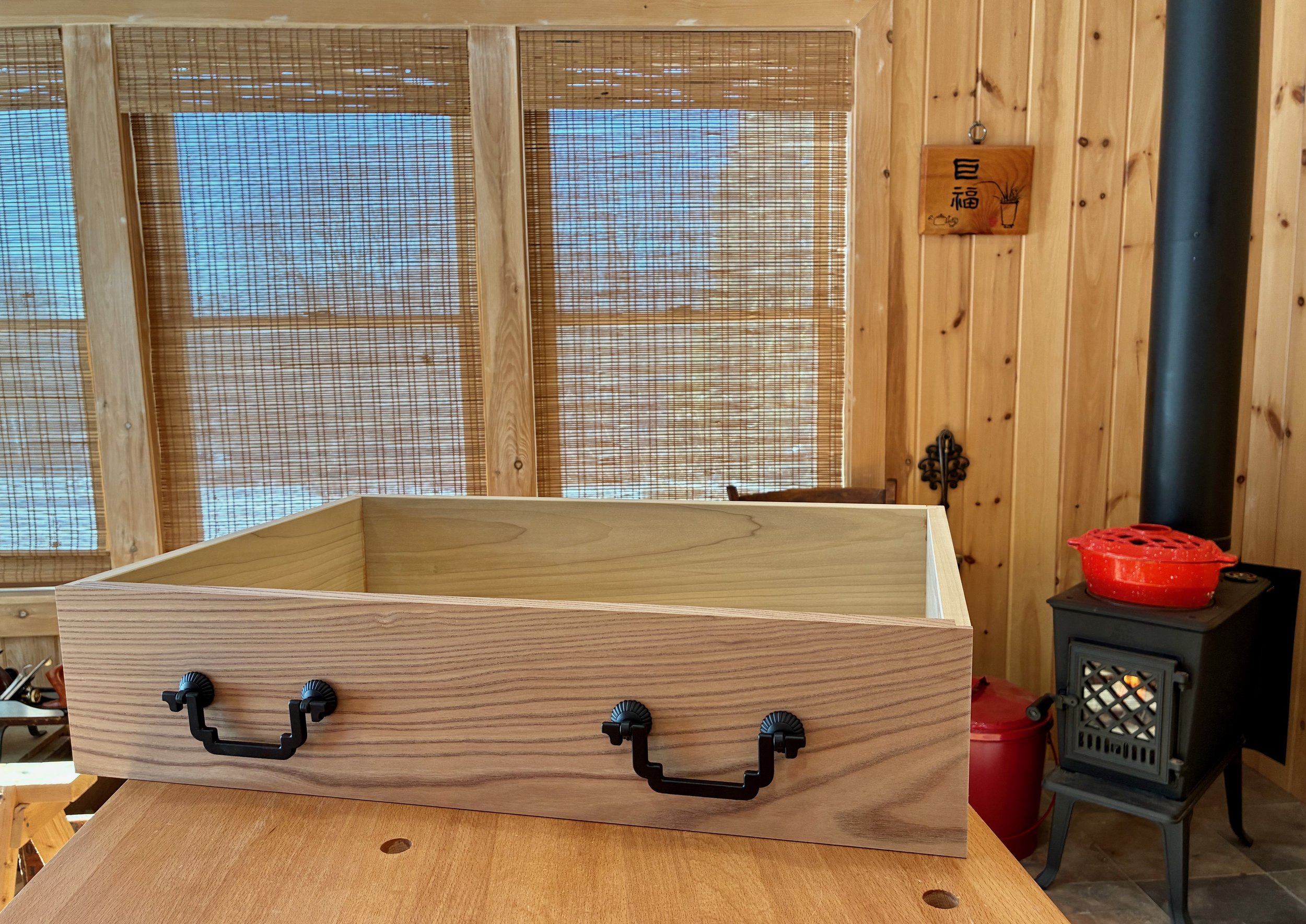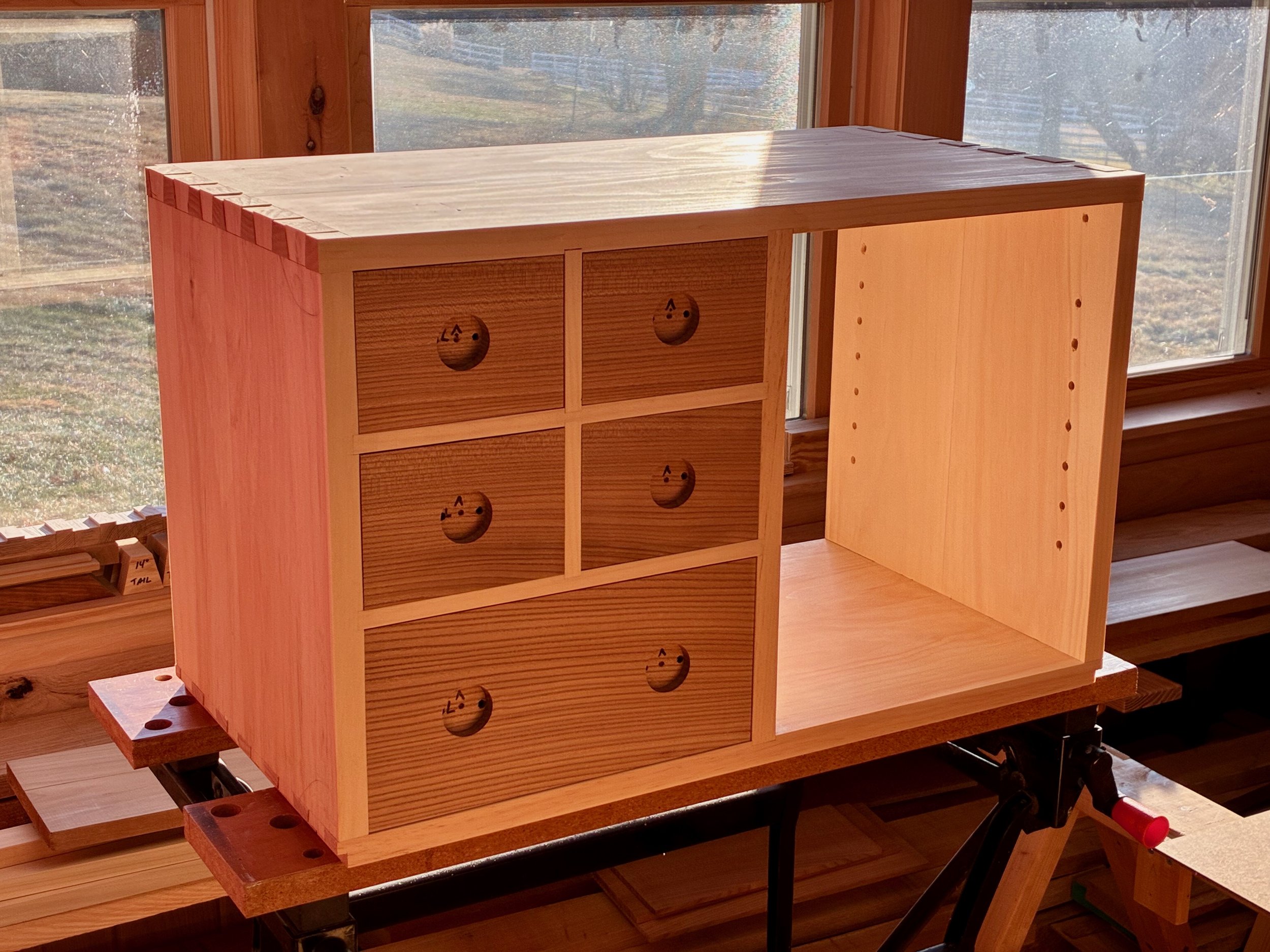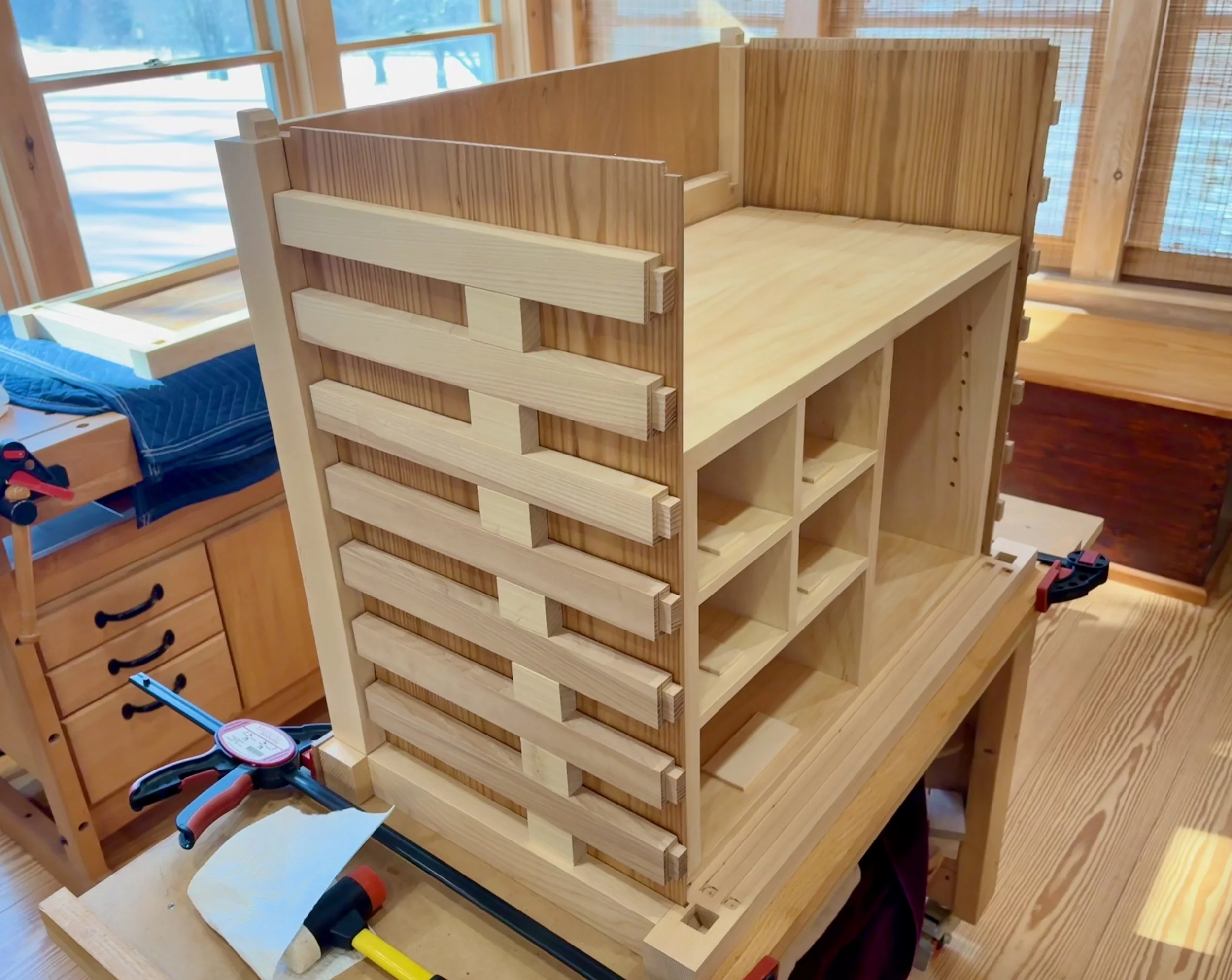 Back in October 2025 we left the Coin Chest in a state of arrested development, where all of the chest’s framework parts were complete and assembled, just not glued permanently in place. This was to permit the construction and insertion of a box to house the interior drawers. That box would rest just behind the Chest’s sliding doors, creating an inner chamber common to many tansu of the merchant chest type. The plan was to build a box to fill the cavity, disassemble the surrounding framework, apply glue to the tenons, and then re-assemble the frame with the box enclosed. This may not be the method used 150 years ago in Japan, but it seemed like it would work, today, under the Red Top.