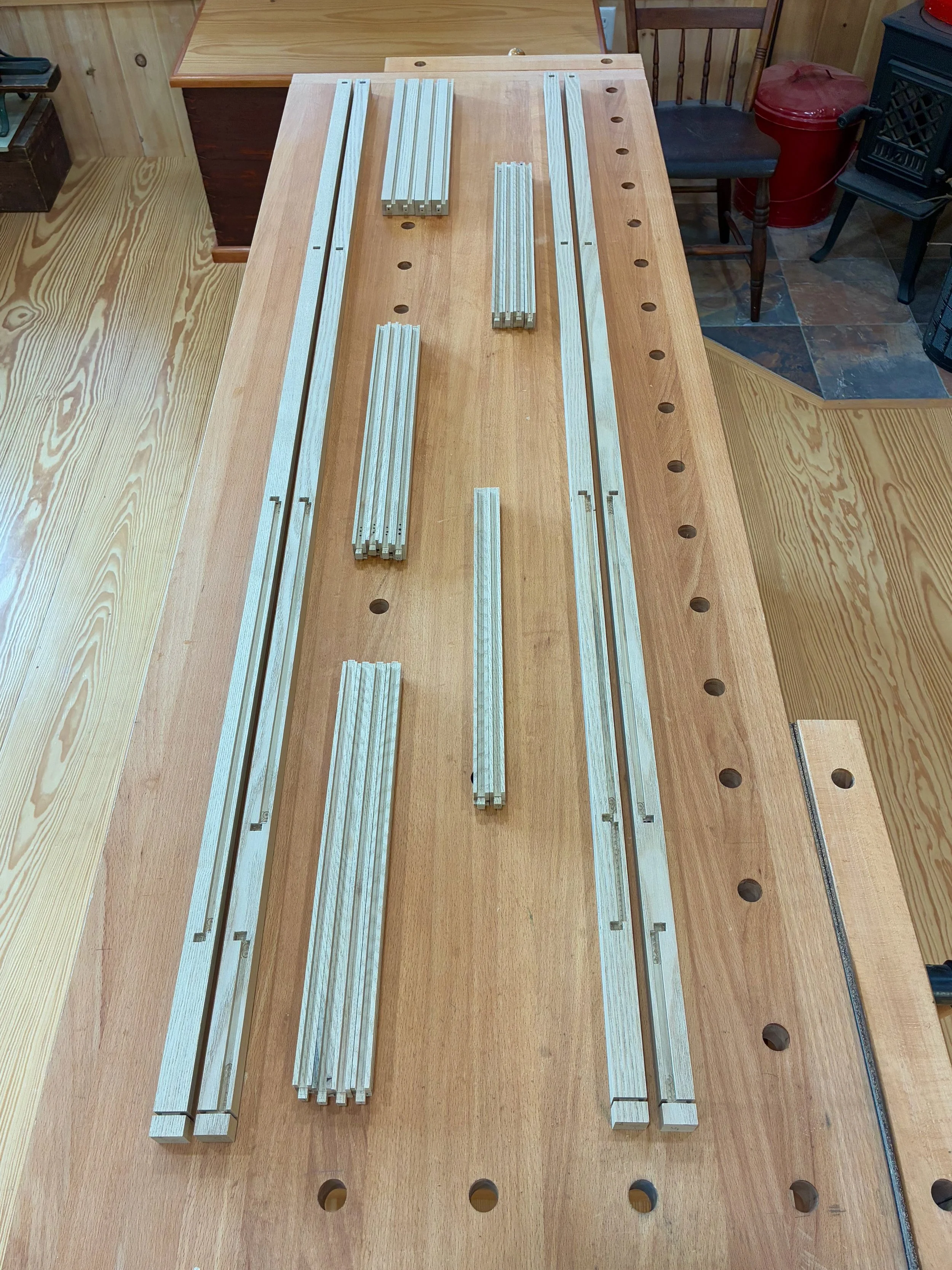 After all the leg poles and rails were cut-out and trimmed to final length, I needed to assign them each a “role” and then fashion the mortises, tenons and grooves for the joinery. These operations variously employed the mortiser, miter saw, table saw, and router table, as well as a Sharpie for labeling what’s what. When complete, 22 value-added parts had been produced.