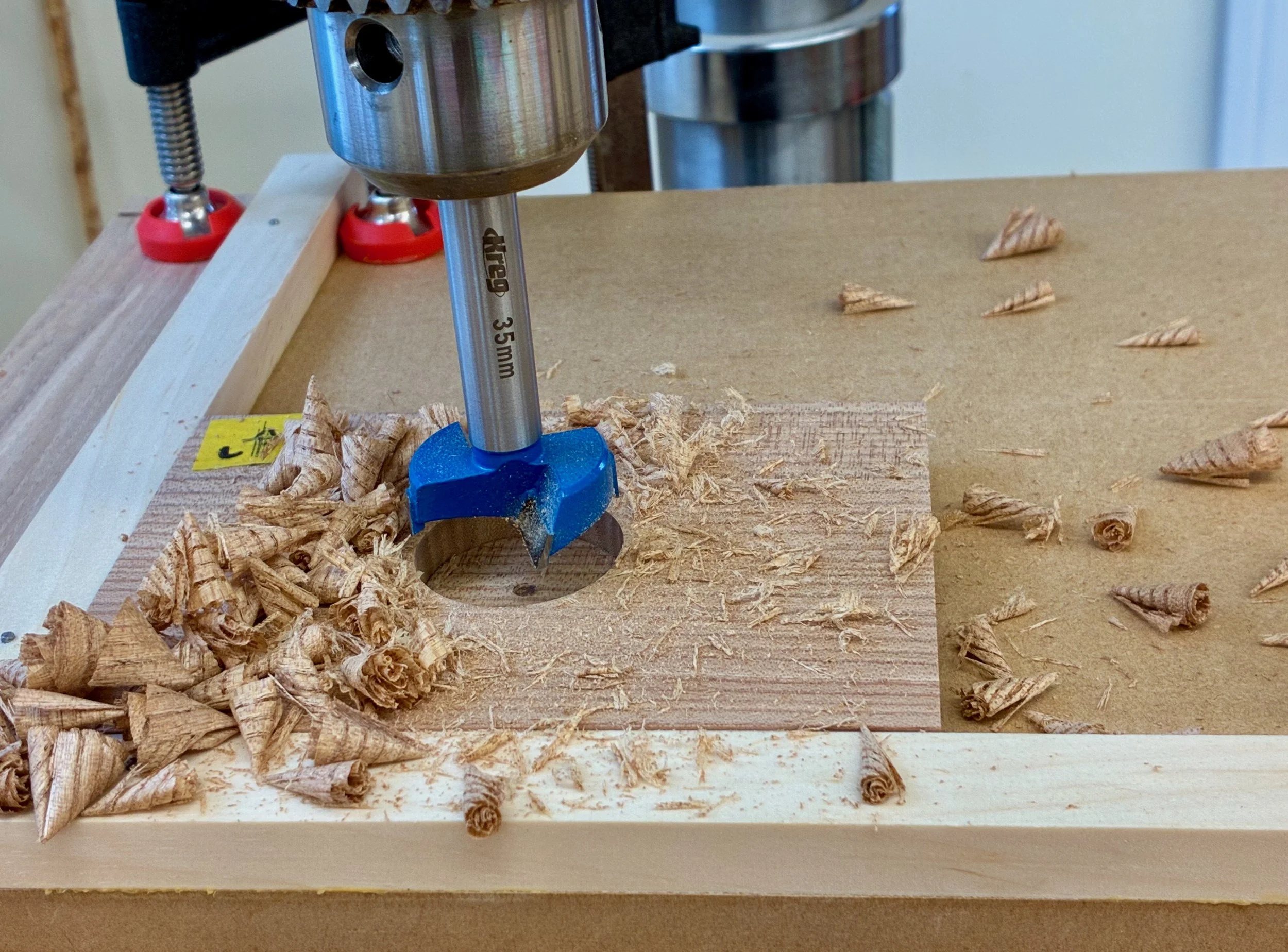 Finally, 35 mm dia. sockets were sunk into the drawer fronts using a Forstner bit at the drill press. I then drilled the mounting screw holes, 2 per socket.