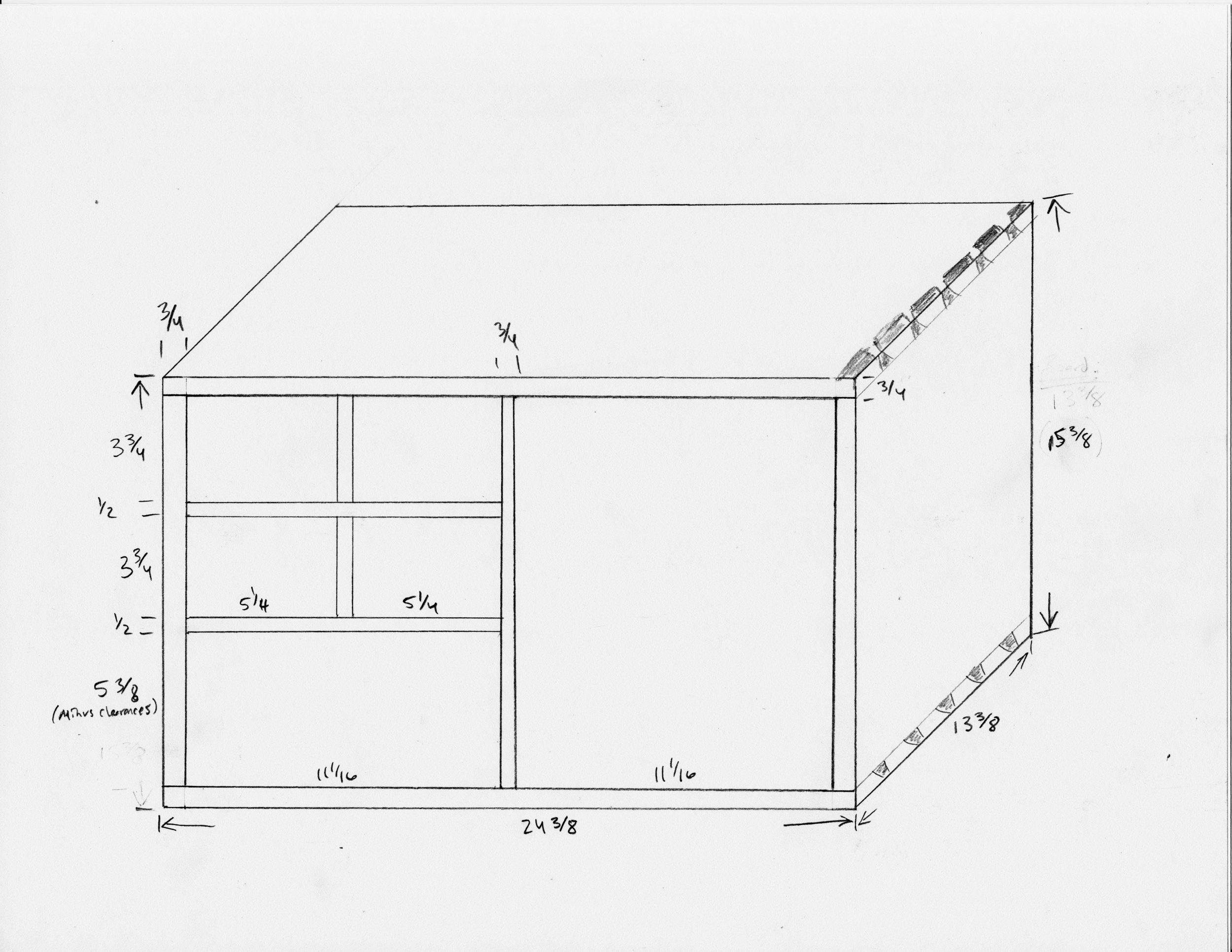 Employing an upper shelf unit substantially narrower than its supporting cabinet (as in Shaker example 159 above) this design came together in the rough drawing shown below.
