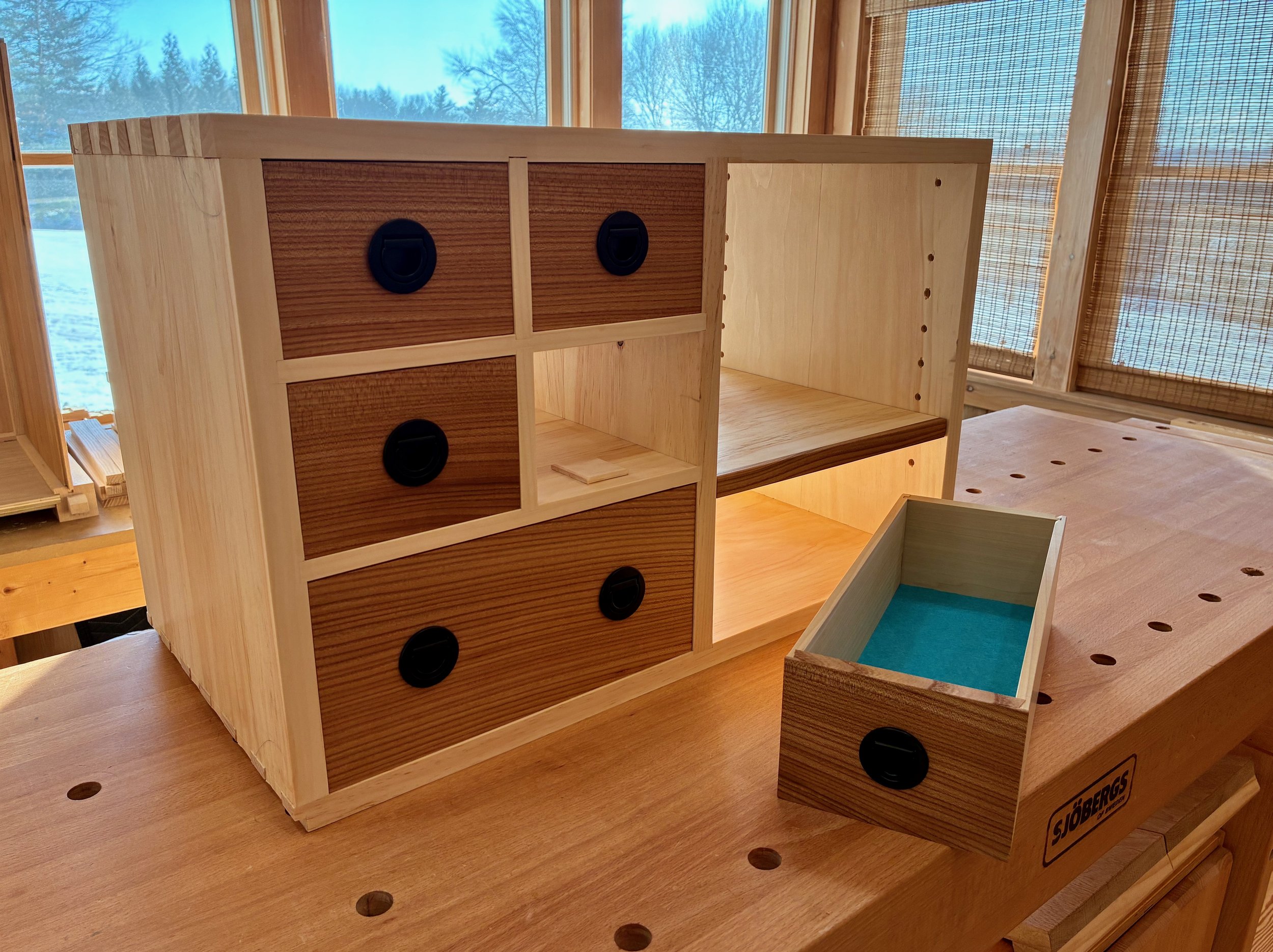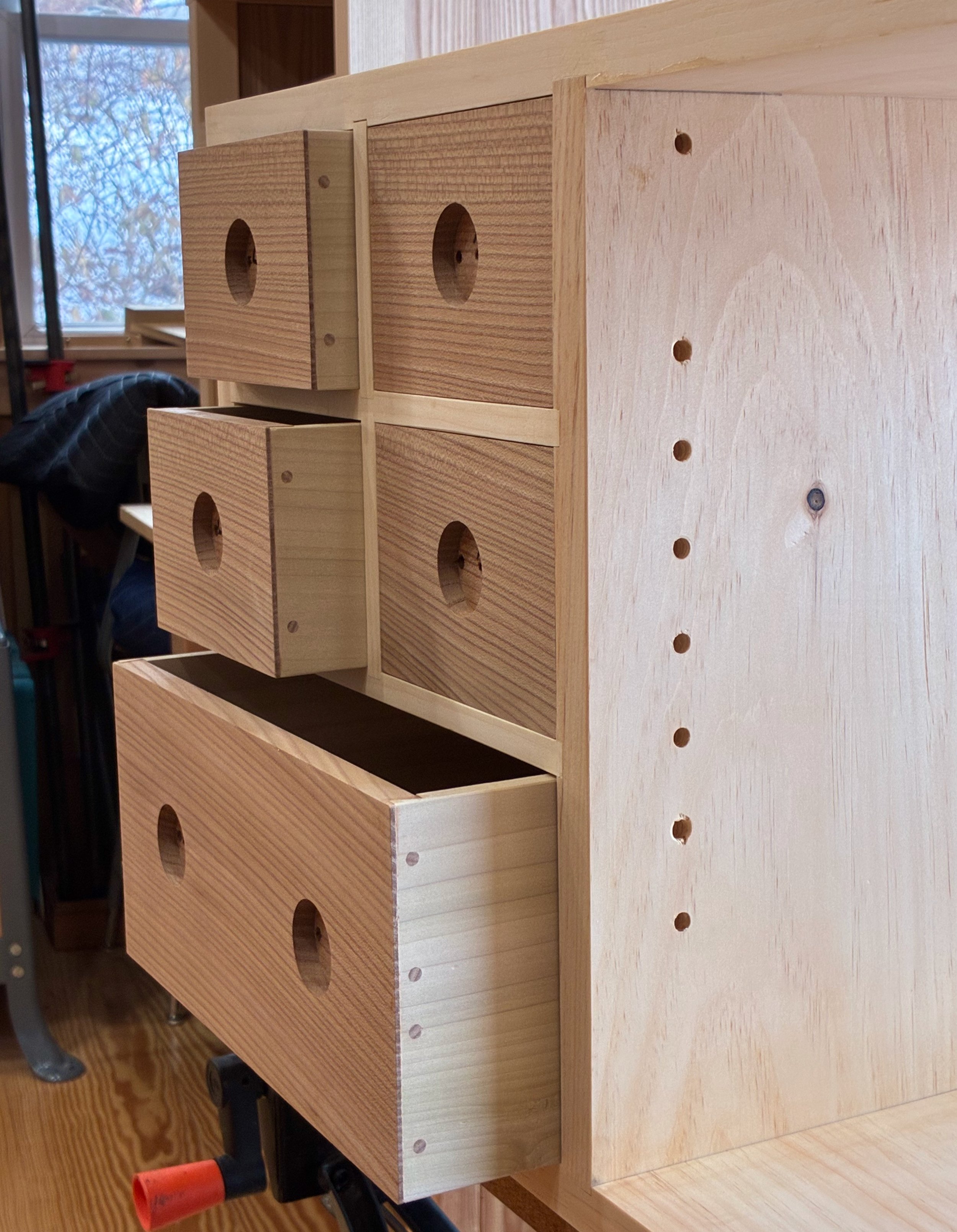 After sawing things flush, and some final sanding, the interior drawer construction was complete. Still deciding on a finishing scheme for these, I put off the hardware installation for now.