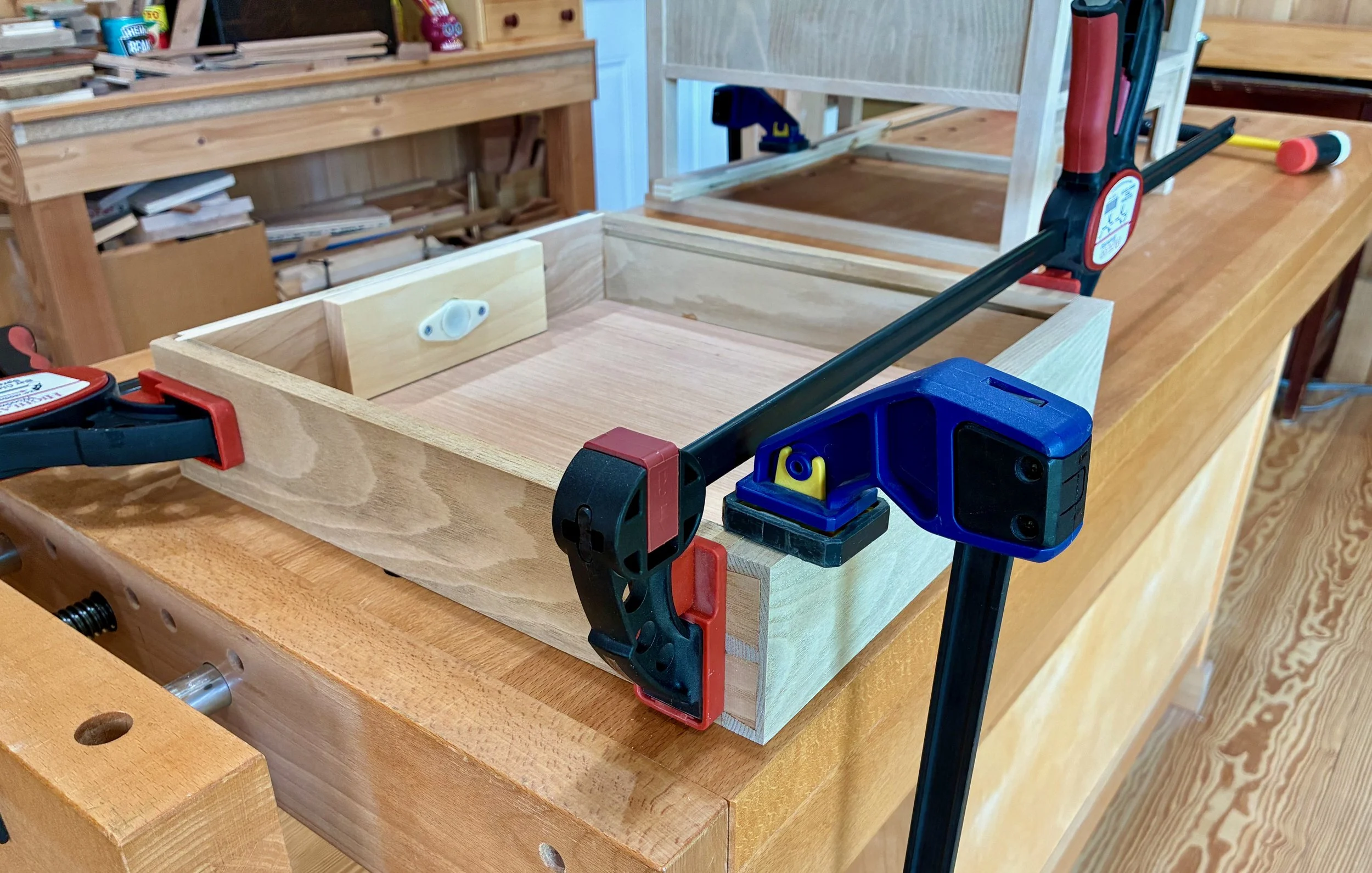 Sparing the details of board prep and joint-making you will be pleased to know that the two drawers came together nicely in their “plump” dry-fit state. That is, when first fashioned, inset drawers squeezed into their cavities are expected to present a tight fit all around, and these had that.