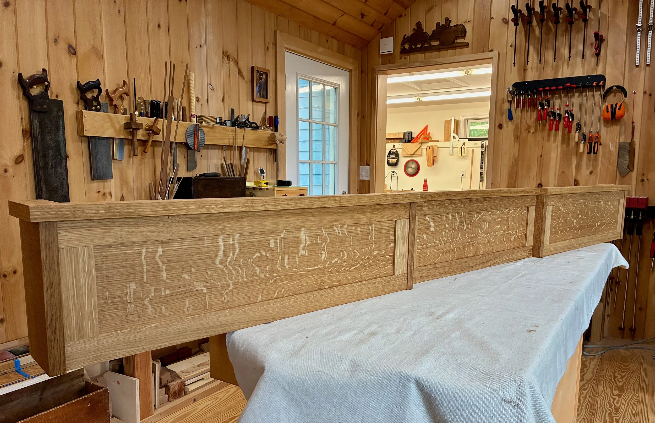 I had a couple 4/4 quarter sawn white oak boards lying about the shop that should work nicely for the body of both cornices, but I would need to pick up another board to complete the top trim. Onward!