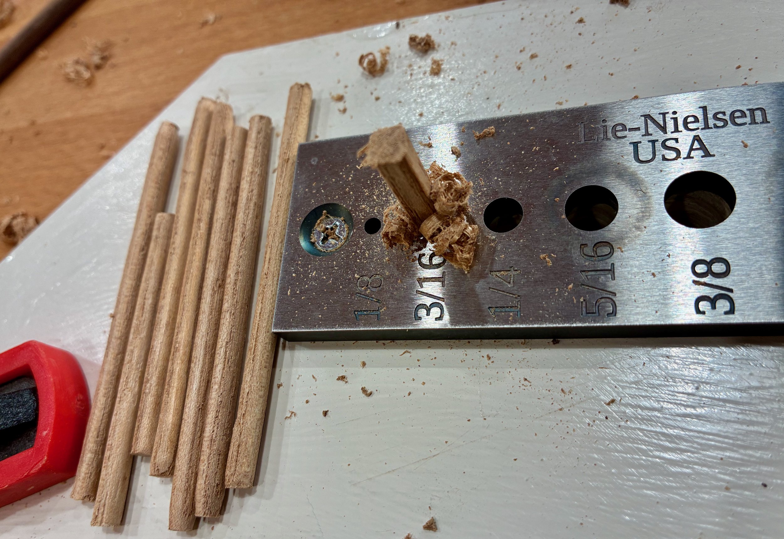 The joints at the drawer fronts were then pinned with 3/16 in. diameter pegs hammered from scrap elm.
