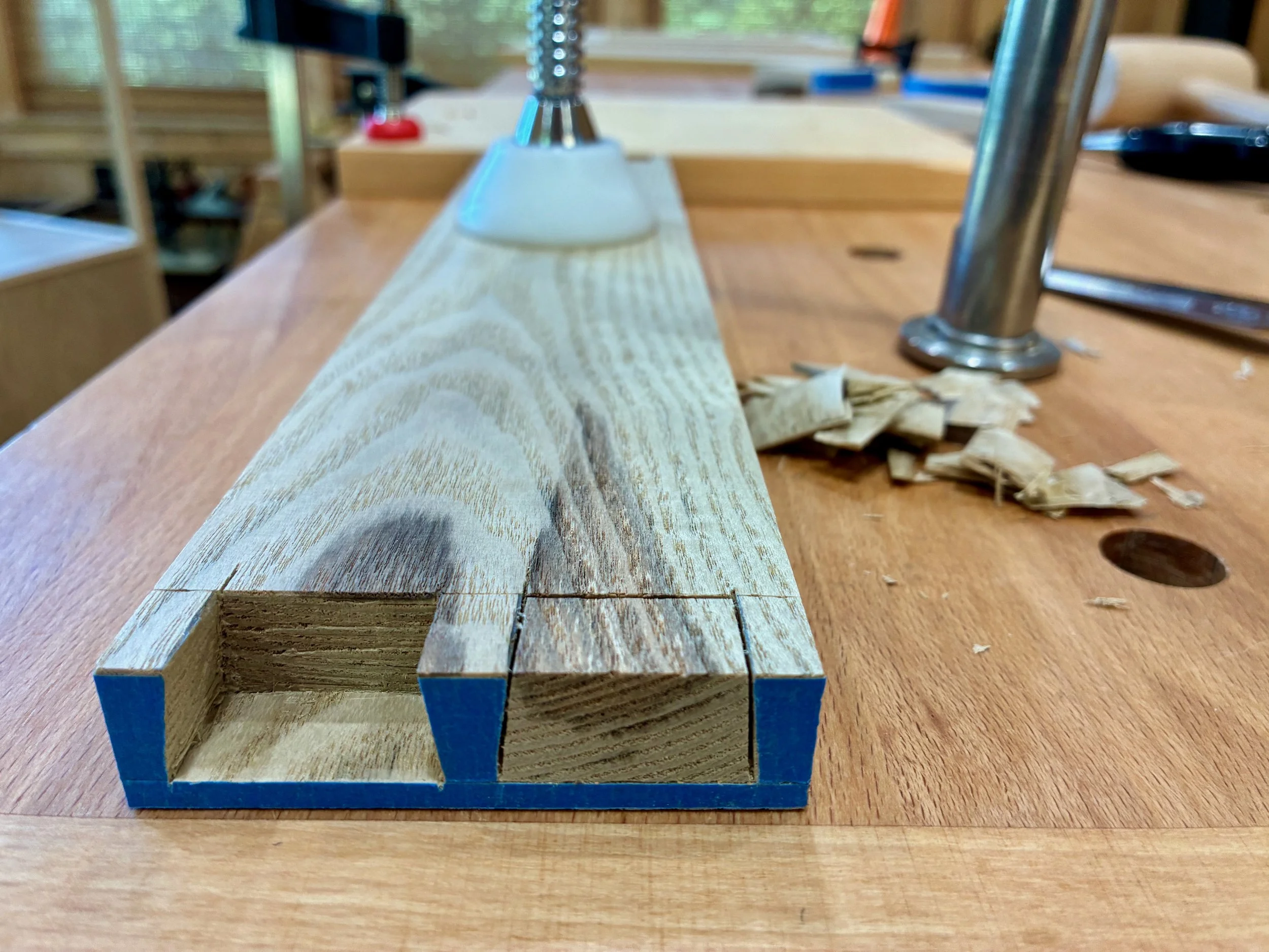 The final task was to customize the drawer interiors for proper chisel storage. The bottom drawer would house my set of six bevel edge chisels, and to support the chisel handles I needed to create a series of semi-circular cradles. I would again use my Forstners for this, and while I did not own the exact dimension bits required to reproduce the original, they were within 1/8 of an inch and so I made do. In the event, I first fastened two boards together with metal straps and then drilled three 1 1/4 in. and three 1 in. diameter holes centered at the seam. Removing the straps gave me the proper cradle, and a spare.