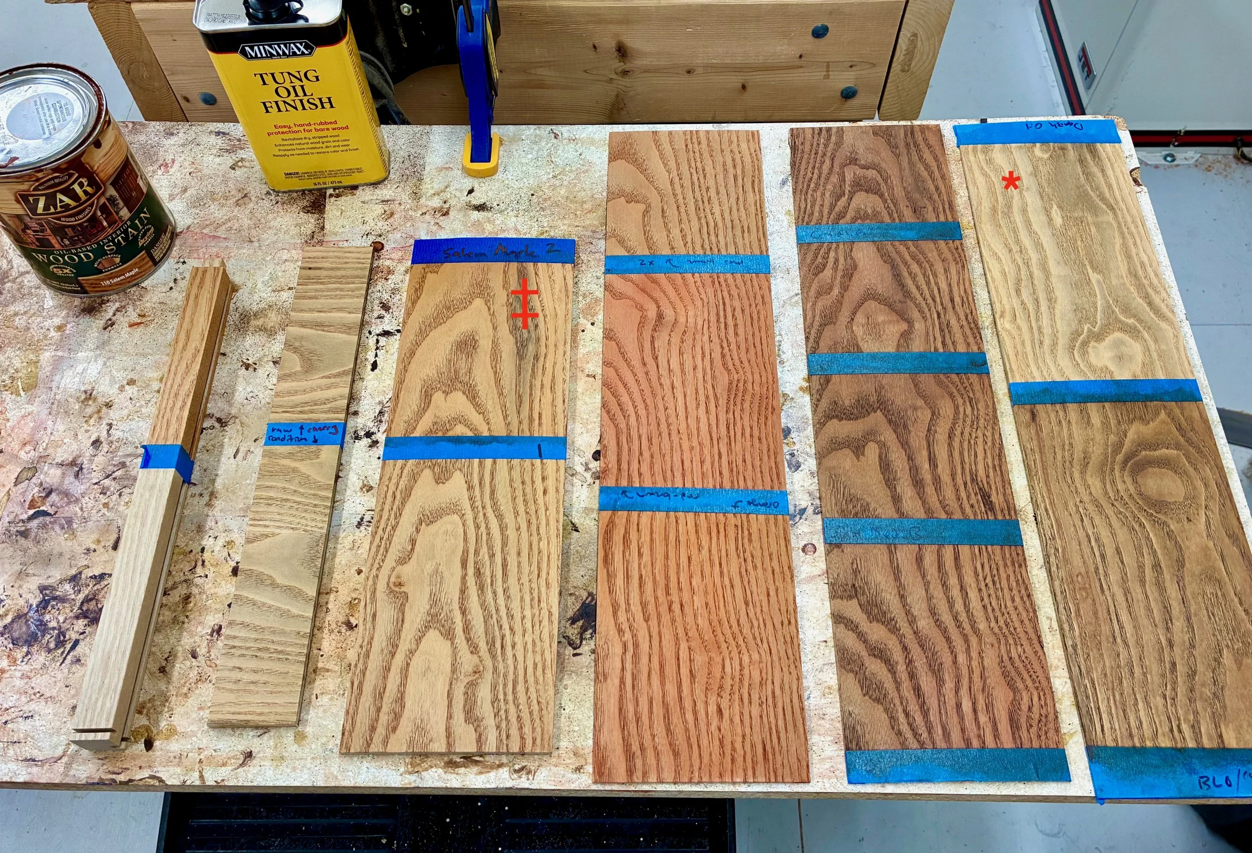 A variety of dyes, glazes and stains were tested with the goal of imparting a better “look” while not going overboard. I picked among the products that I already owned, and after a few days of play landed on a nice ZAR® stain by the name of “Salem Maple” (Red Top Translate: “reddish brown”). On my scraps it seemed to bring the grain to the fore while imparting a more uniform background red that worked better with gray. Sold! I would also wait until the very end of the build to stain and varnish the piece.