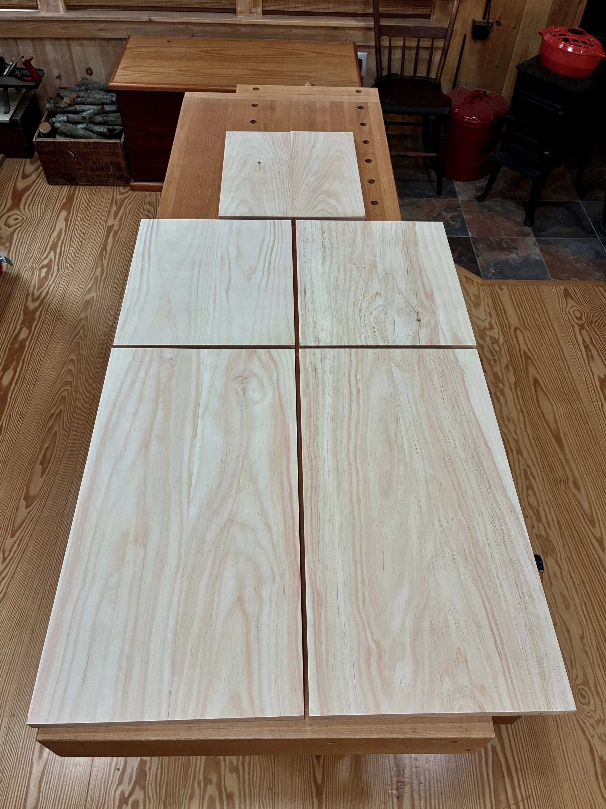 During assembly, the panels would slide into grooves within the frame structure and be left “floating” to expand and contract in response to changing humidity. As such, following some smoothing operations, I gave them their first coat of the polyurethane finish prior to glue-up.