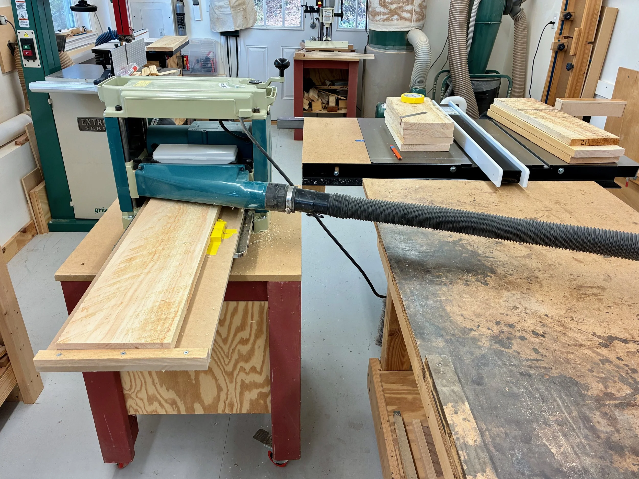 The panels came next. These were produced en mass from a single 4/4 plain sawn board to ensure consistency of grain and color. The plank was first chopped and ripped to rough dimensions, and the resulting pieces were flattened on both sides at the jointer. Still too thick, these boards were then re-sawn down the spine at the band saw to get “two for one”. The thinner boards were each thickness planed to 1/4 in. depth and ripped to their final width at the table saw - 13 plus a spare.