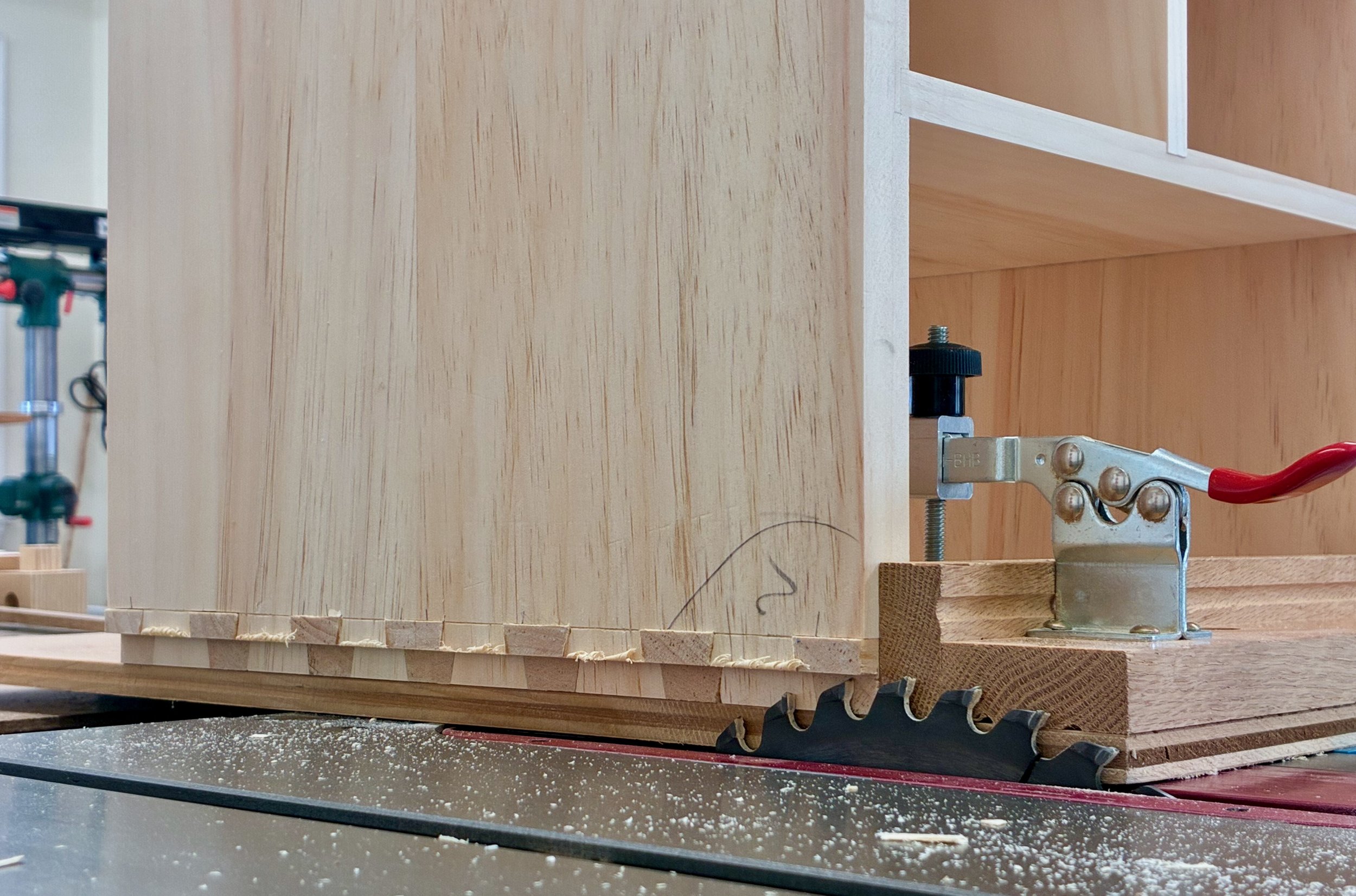 As designed, the box was still 1/2 inch too wide to fit within the case. You see, I made that box from 3/4 in. boards but, to match the drawer divider widths, I wanted only a 1/2 in. reveal around the edges once situated within the case. Also, tucking the box behind the case framework in this manner assures that no gaps would be seen. To achieve a fit, I therefore had to cut a rabbet along the bottom sides and around the entire back of the box. This was accomplished at the table saw.