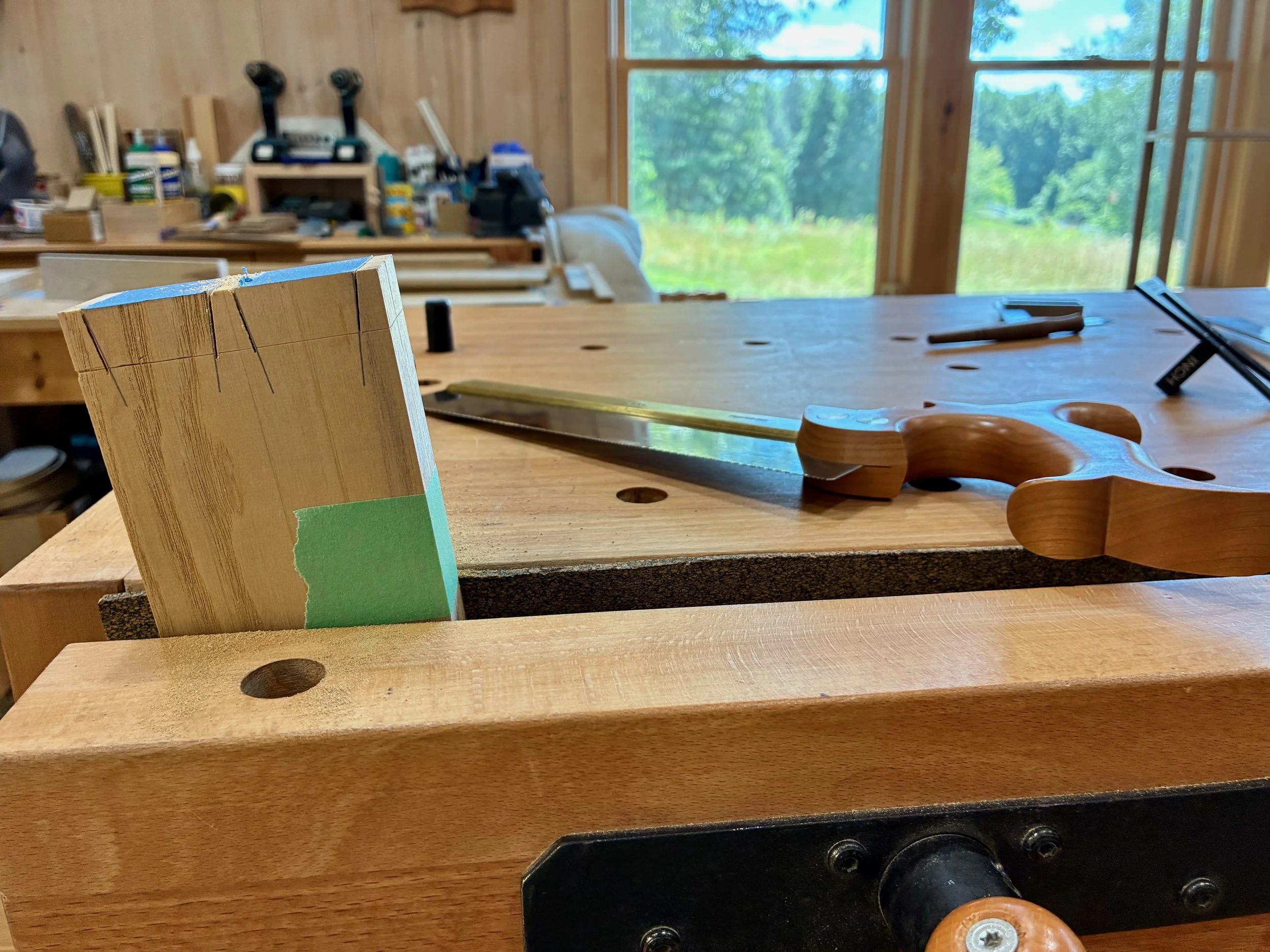 Time to tackle the drawer. Since the original was drawerless, I would be co-opting the space below the doors for this feature. An inset drawer here would be nearly indistinguishable from the original, yet provide useful space for knitting needle storage. This slim, 3 inch drawer would be constructed using half-blind dovetails in front and lock joints for the back. A thin plywood board would be used for the bottom to maximize cavity height. After choosing the best grain from the remaining stock, the drawer front was cut to exact dimensions and then the sides were cut to a matching height from less-distinguished sassafras. Once the boards were marked I used my new dovetail saw to cut the joint elements. Sassafras is a soft wood to saw and chisel, making this an easy maiden voyage and one of my better dovetail experiences.