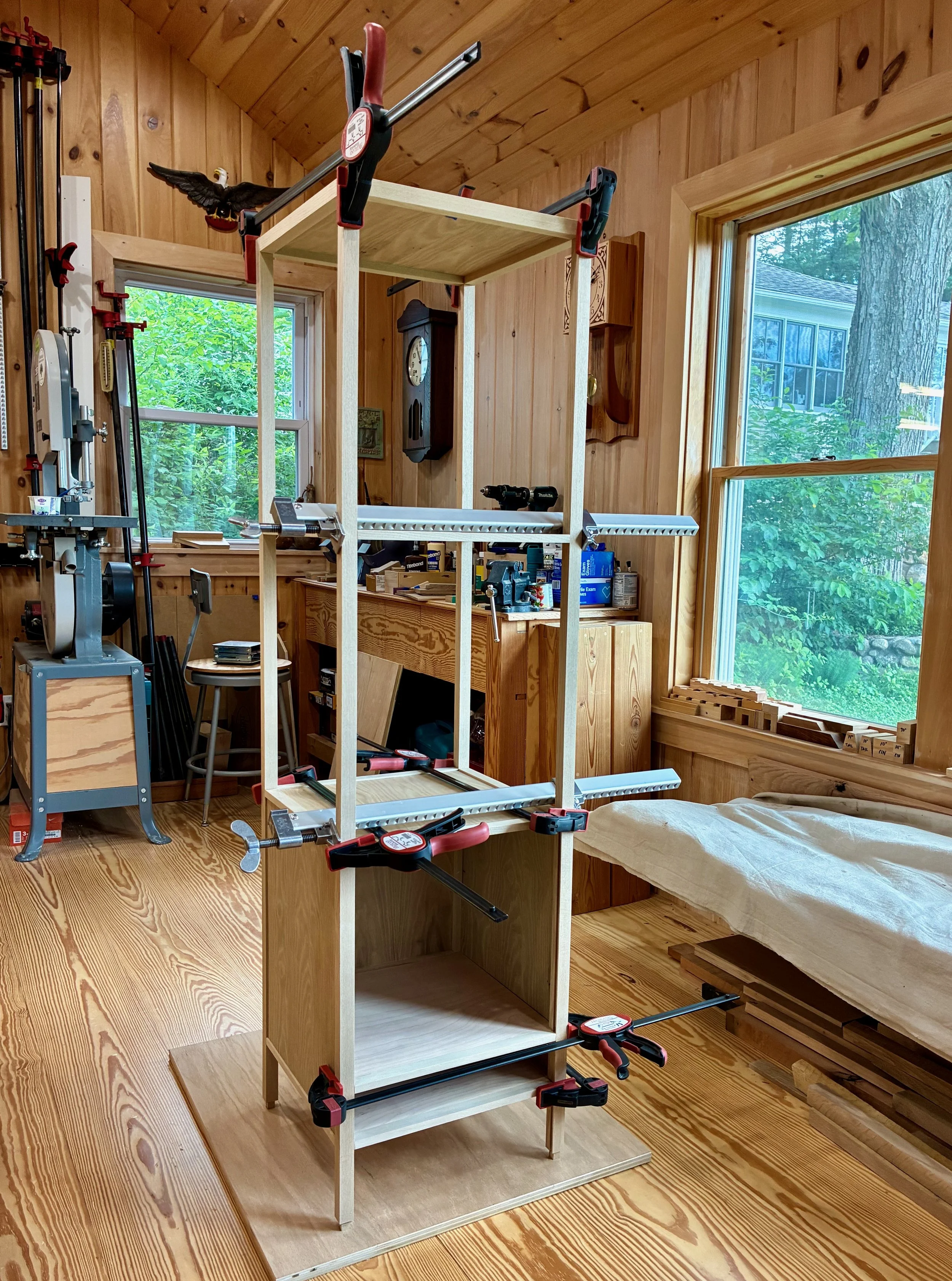 At last, it was time to put it all together. There remained a few trim elements to complete on top, but these would be best addressed once the bulk case was in-hand. To create the cabinet portion, the side parts were slid into glue-filled grooves within the preassembled shelf. Glue was then applied to rabbets along the back and top of the sides, into which the back and top boards could be slid. The nascent case was then clamped square to cure.
