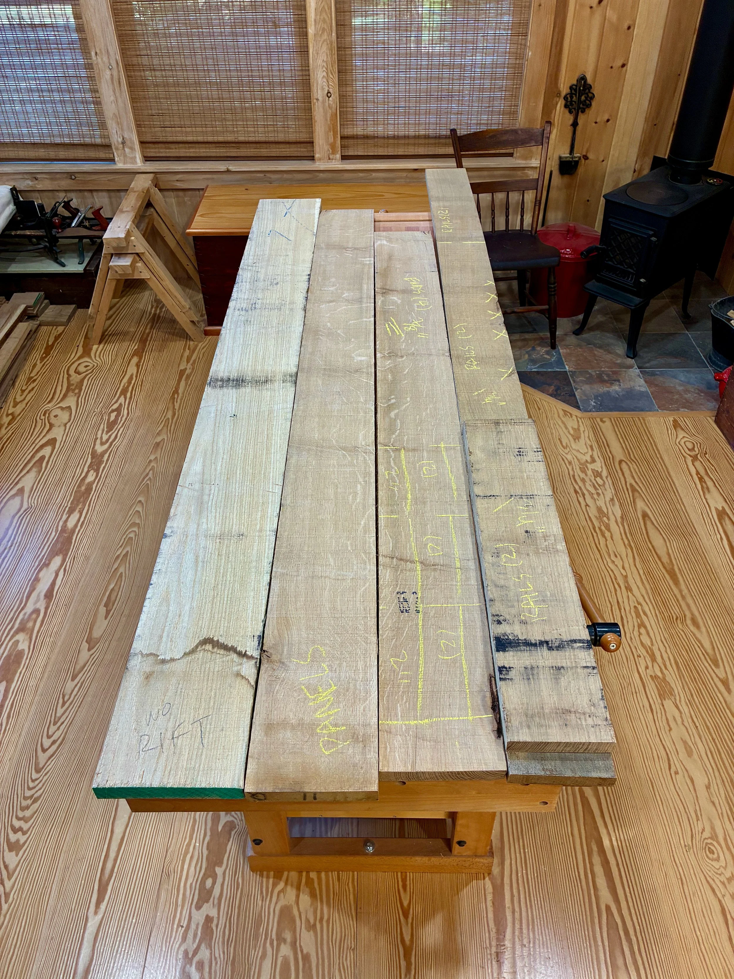 Four 4/4 white oak boards, three quarter sawn and one rift sawn, were procured from Reader’s and marked with chalk for processing into stiles, rails, panels and trim.