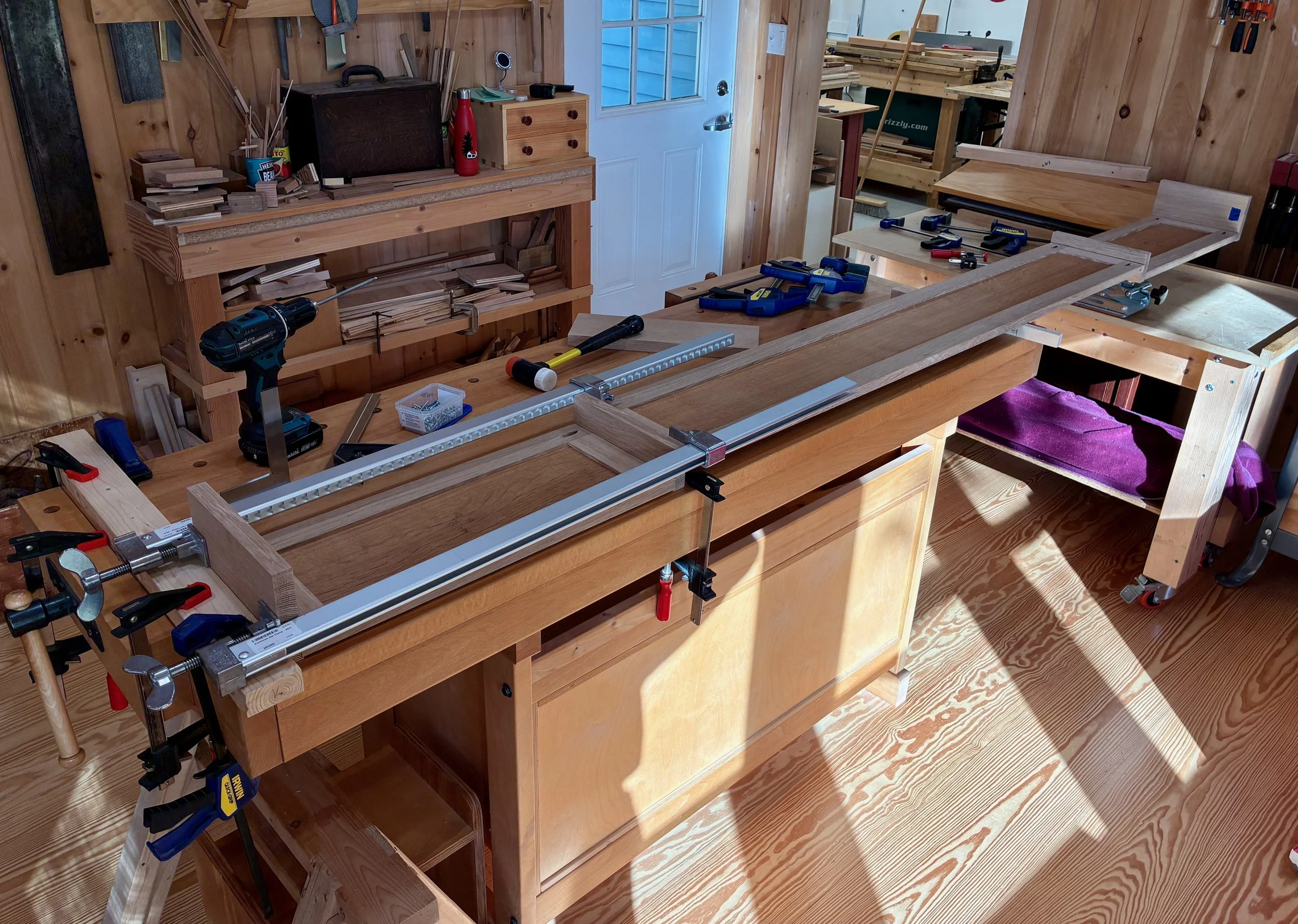 To complete the build, the end caps were attached to the smaller panels with pocket screws, and then these sections were connected to the center panel in a similar manner. At almost 9 feet in length it was a challenge to support and hold the thing square while it was coming together. I’m not saying I need a bigger workshop, just maybe more clamps.