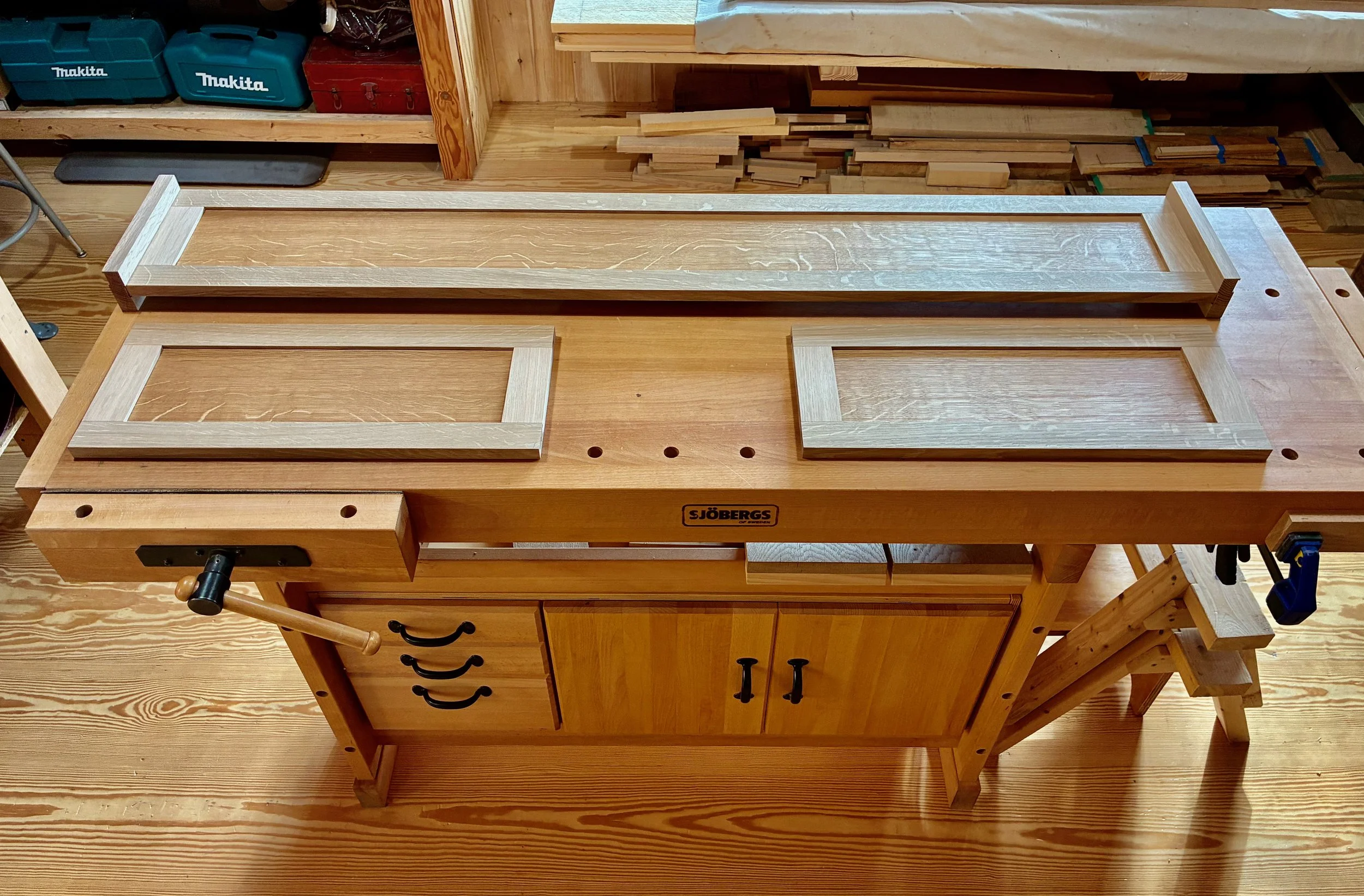 Following assembly, the top trim was fabricated from rift sawn wood and attached as before. The cornice was then treated with two applications of boiled linseed oil and allowed to cure for a few days afterwards.